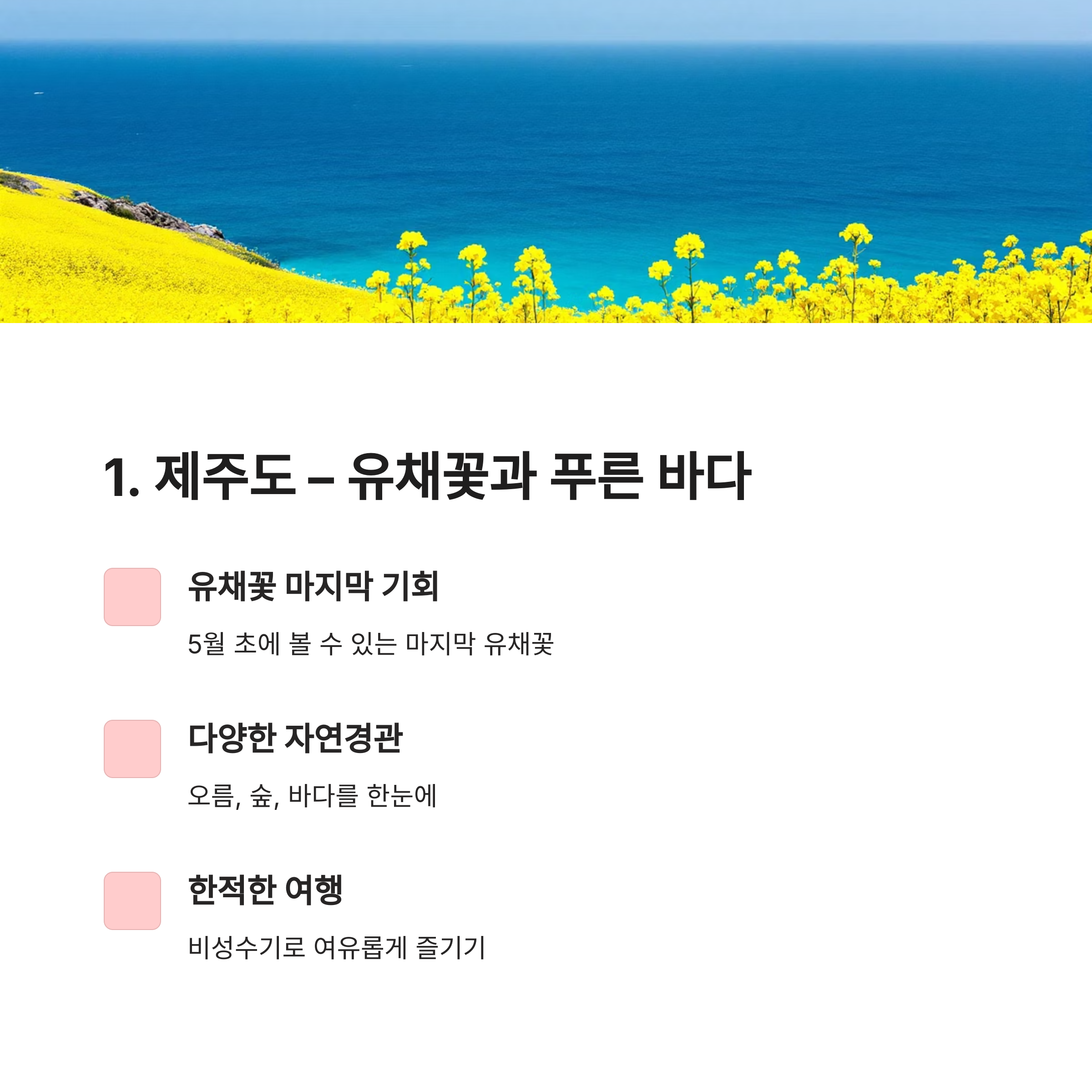 1. 제주도 - 푸른 바다와 유채꽃의 조화