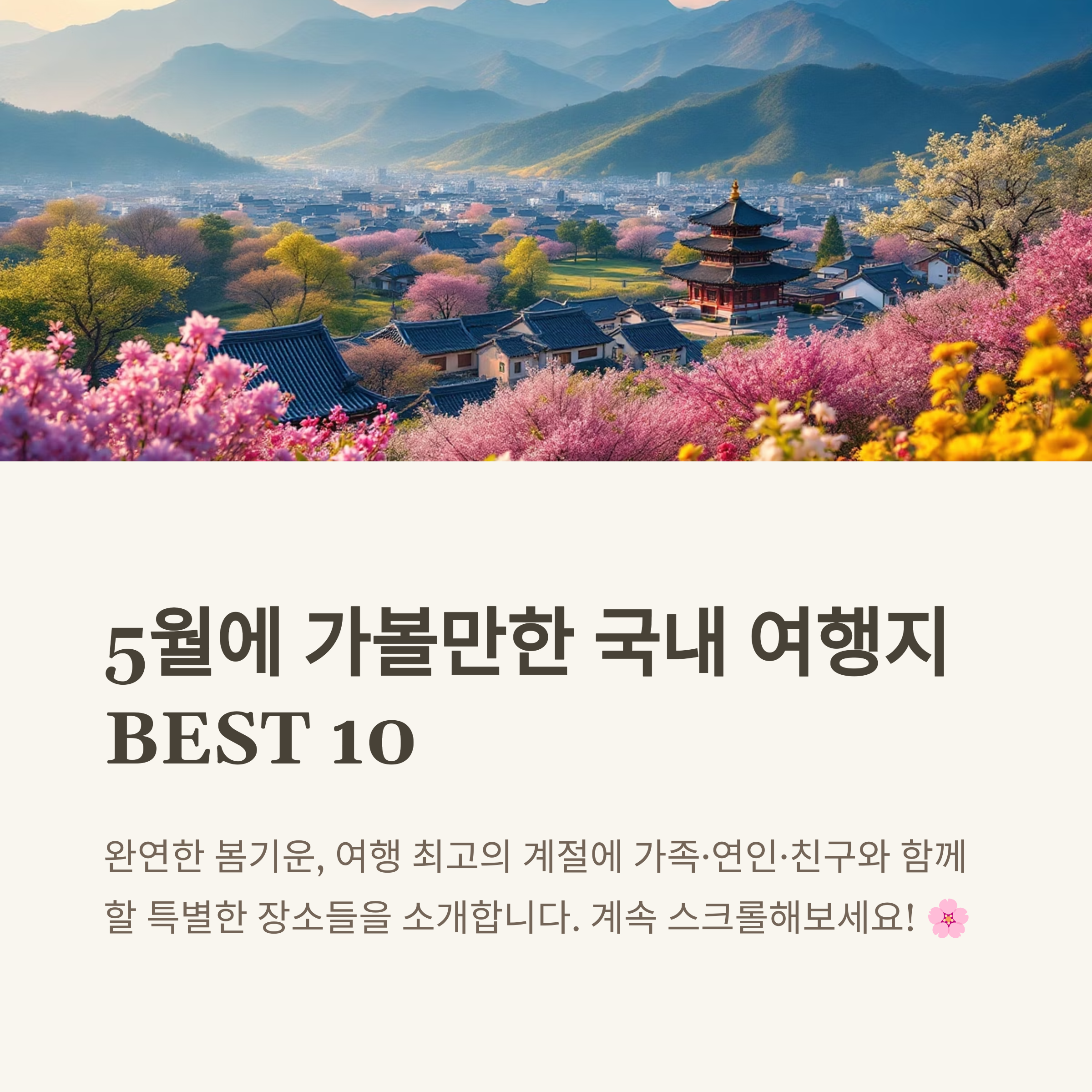 완연한 봄기운이 느껴지는 5월은 여행하기 가장 좋은 계절입니다. 여름의 무더위가 시작되기 전, 봄의 여운을 만끽할 수 있는 5월에 가볼만한 국내 여행지 베스트 10을 소개합니다. 가정의 달을 맞아 가족, 연인, 친구들과 함께 특별한 추억을 만들어보세요. 🌸