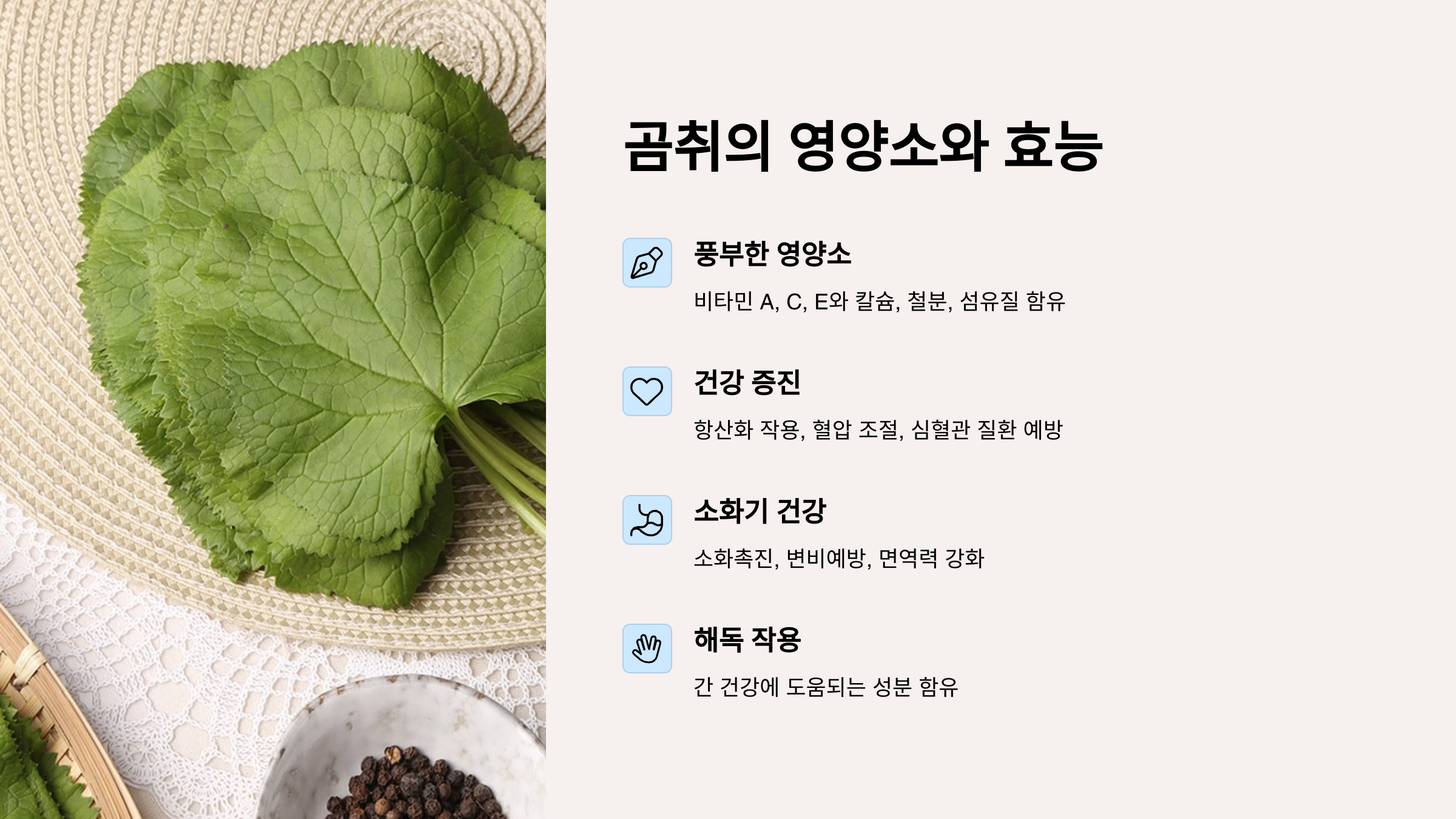 본격적인 곰취장아찌 만드는 법을 알아보기 전에, 곰취의 영양성분과 효능에 대해 알아보겠습니다. 곰취는 비타민 A, C, E가 풍부하고 칼슘, 철분 등의 미네랄이 함유되어 있어 건강에 매우 좋은 식재료입니다.