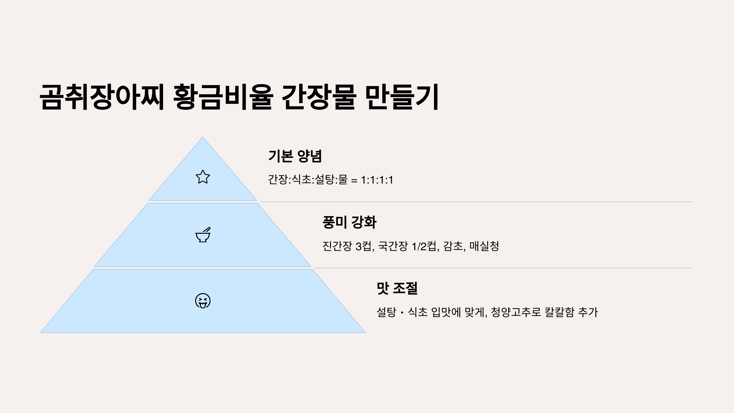 곰취 장아찌 황금레시피의 핵심은 바로 절임 양념장입니다. 균형 잡힌 맛을 내기 위해 아래 과정을 따라해보세요.