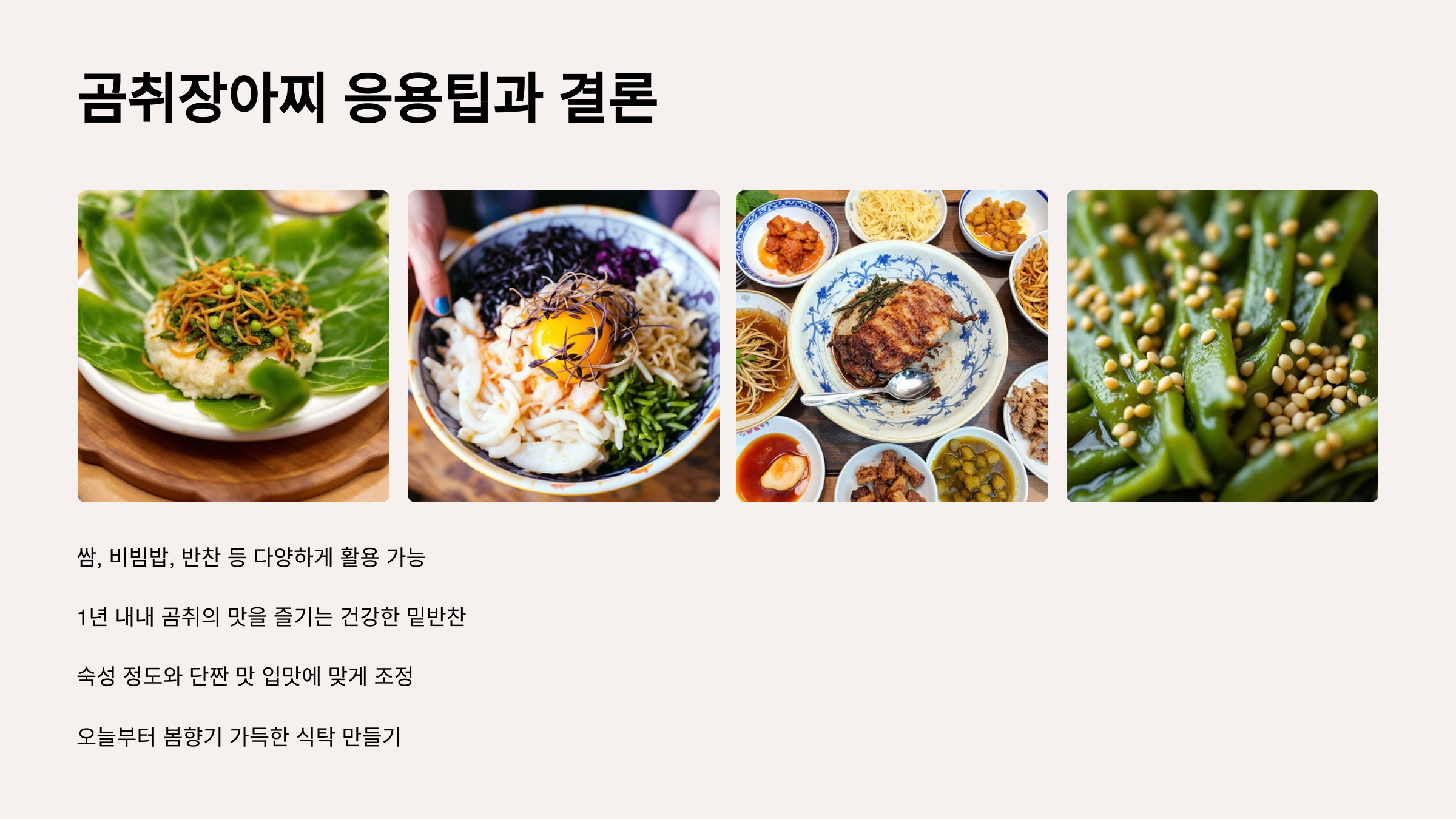 - 곰취장아찌 무침: 오이, 당근 등과 함께 무쳐 새로운 반찬으로 재탄생시킬 수 있습니다.