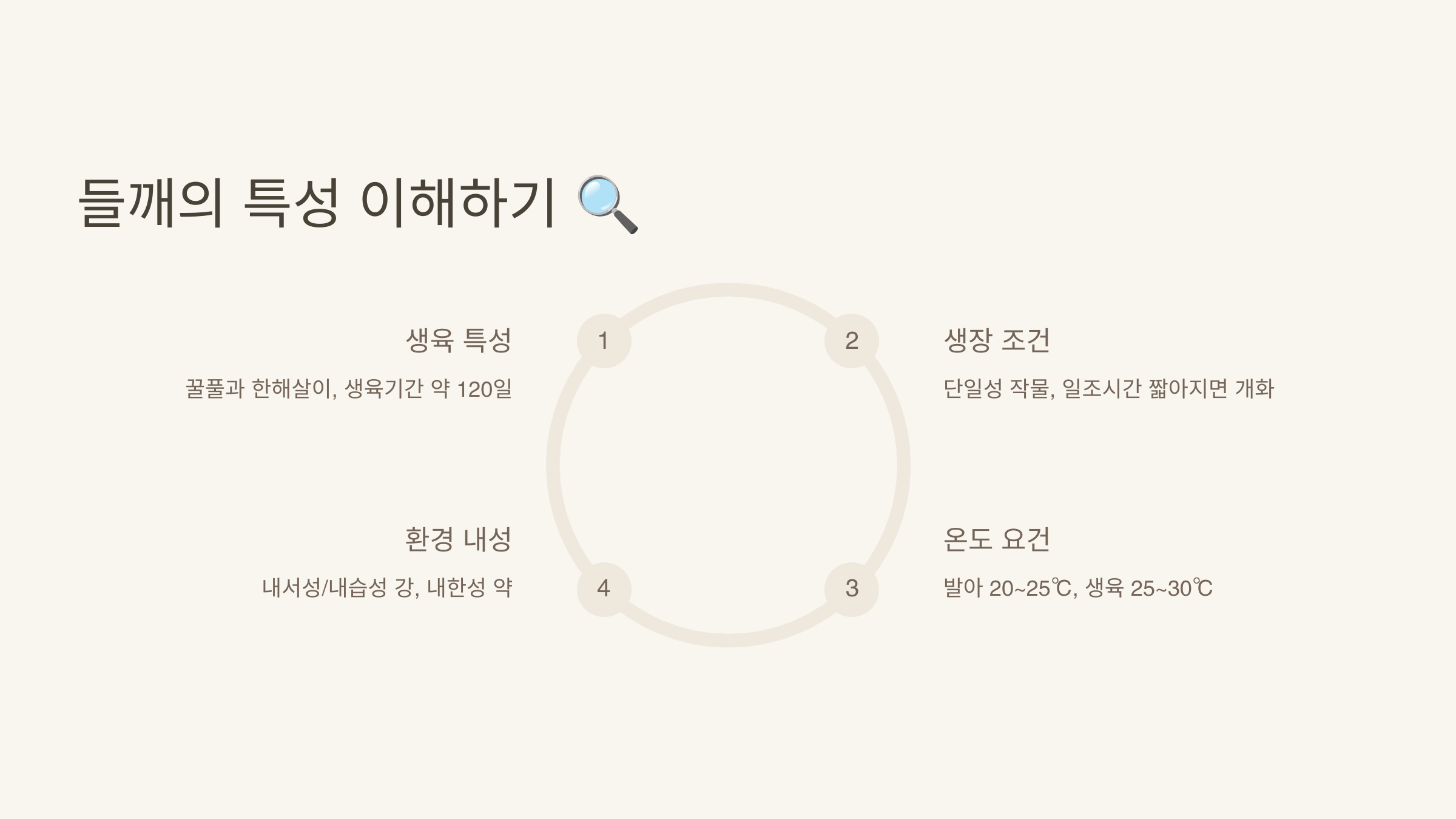 💡 전문가 팁: 들깨는 연작장해에 약하므로, 가능하면 3~4년 동안 같은 장소에서 재배하지 않는 것이 좋습니다. 전년도에 고추나 토마토와 같은 가지과 작물을 심었던 곳이 들깨 재배에 적합합니다.