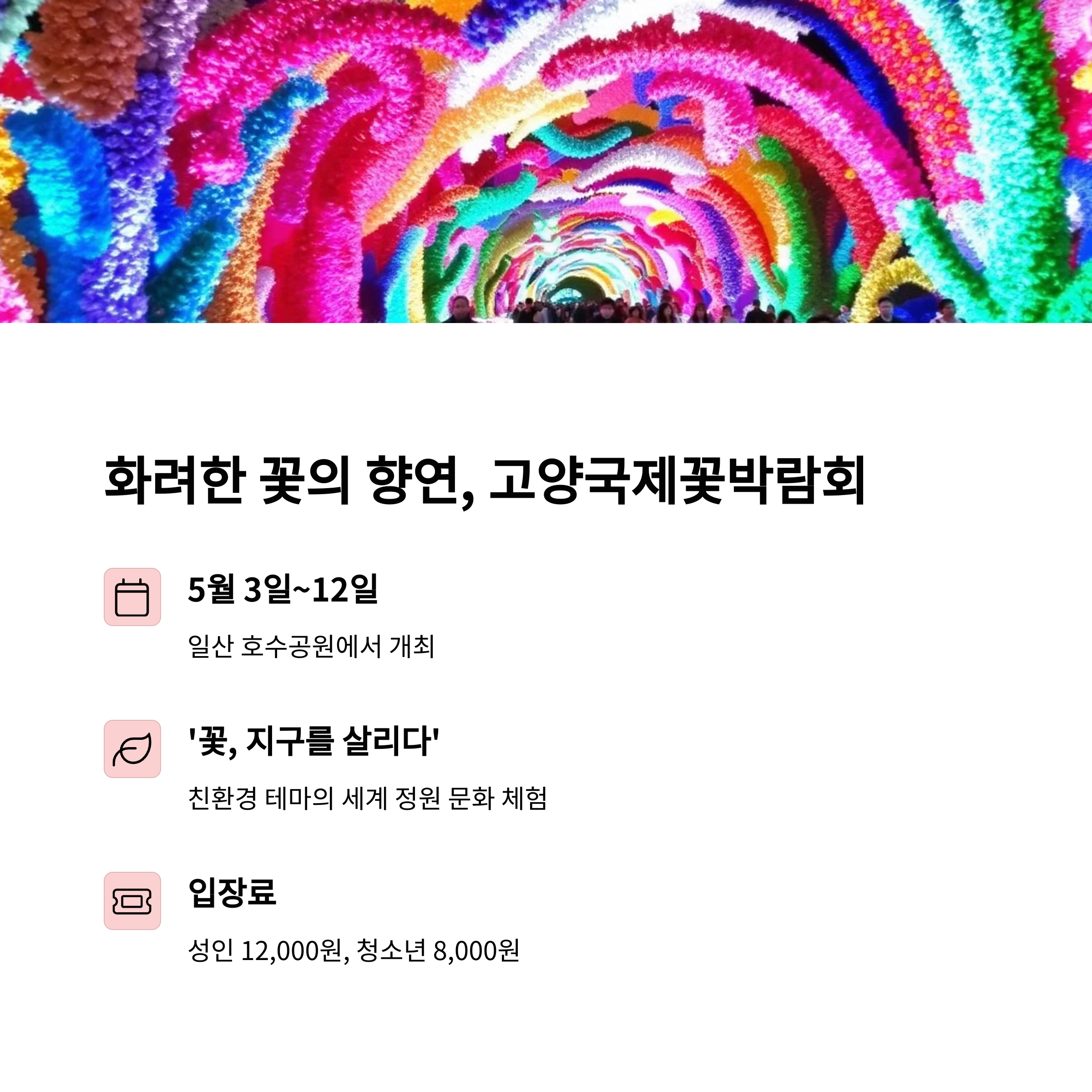 경기도 고양시 일산 호수공원에서 열리는 고양국제꽃박람회는 국내 최대 규모의 꽃 축제입니다. 2025년 5월 3일부터 12일까지 '꽃, 지구를 살리다'라는 주제로 개최되며, 세계 각국의 다양한 꽃과 정원 문화를 한자리에서 만날 수 있어요.