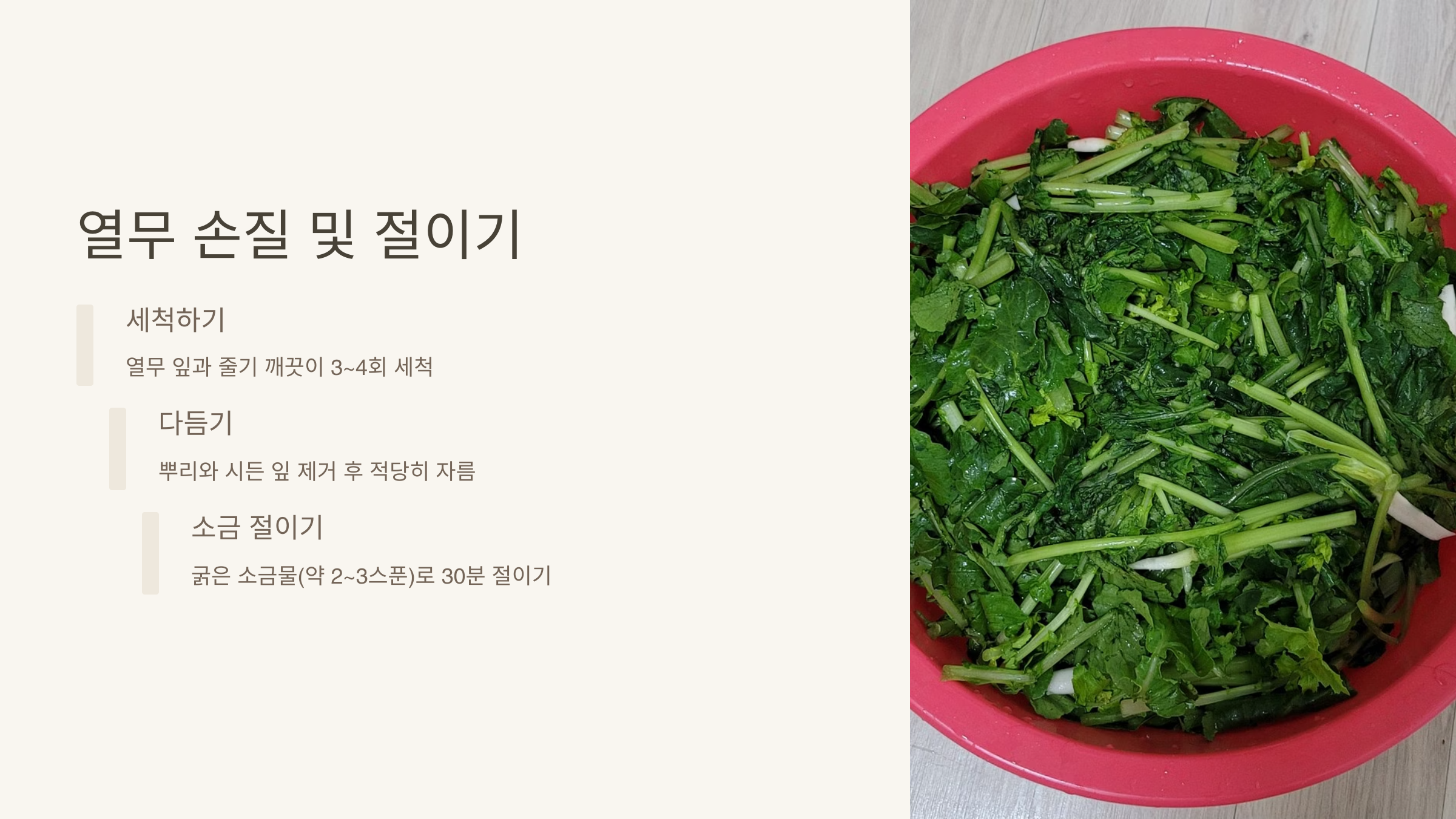 | 열무 절이기 | 30분~1시간 | 소금 3% 비율로 절이기 |