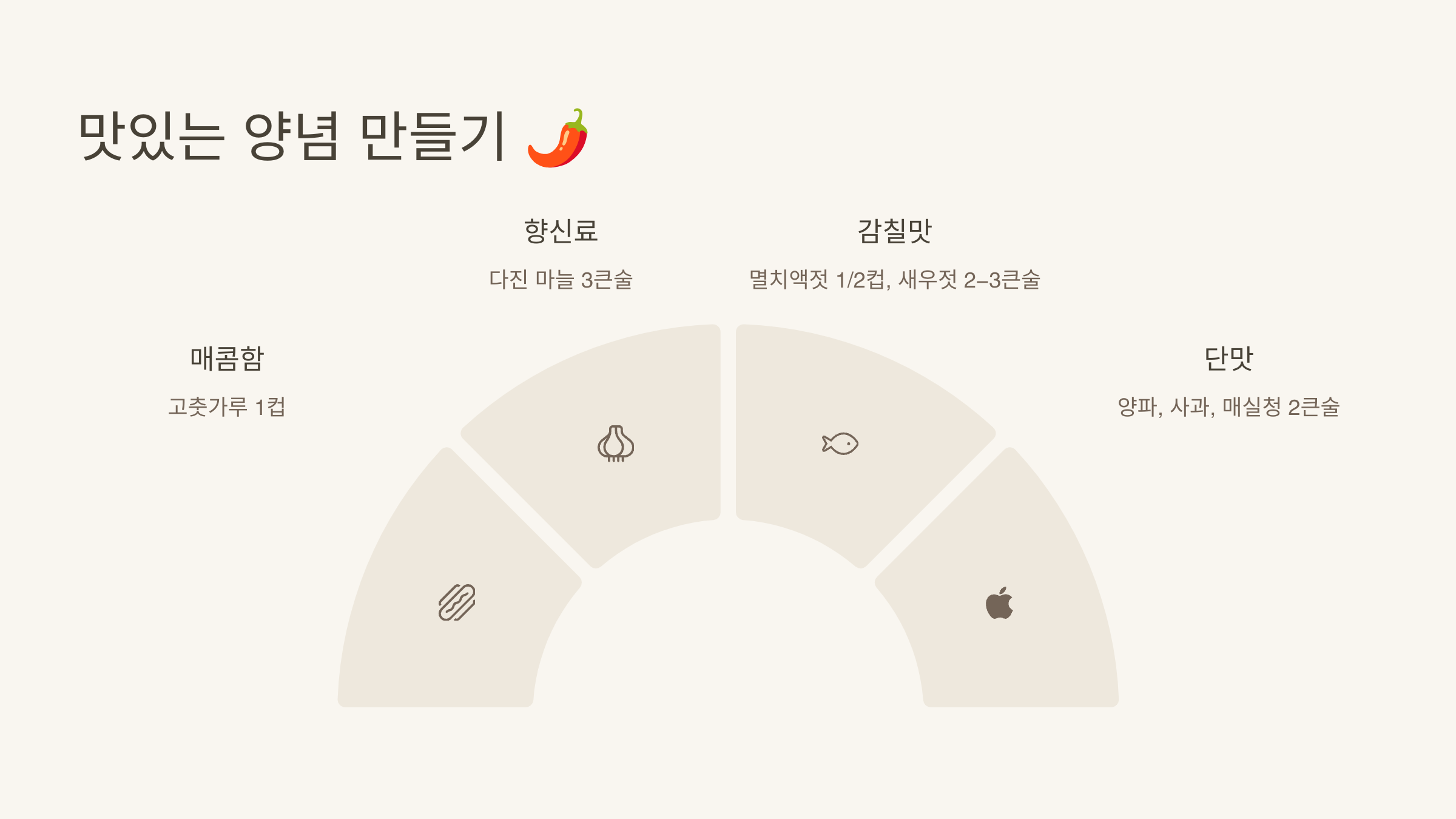 고춧가루는 색이 선명하고 맛이 진한 국내산을 사용하면 더 좋습니다. 양념을 만들 때는 먼저 고춧가루와 액젓류를 섞은 후 나머지 재료를 넣으면 고춧가루가 뭉치지 않고 균일하게 섞입니다. 기호에 따라 청양고추를 추가하면 더 매콤한 맛을 즐길 수 있어요.