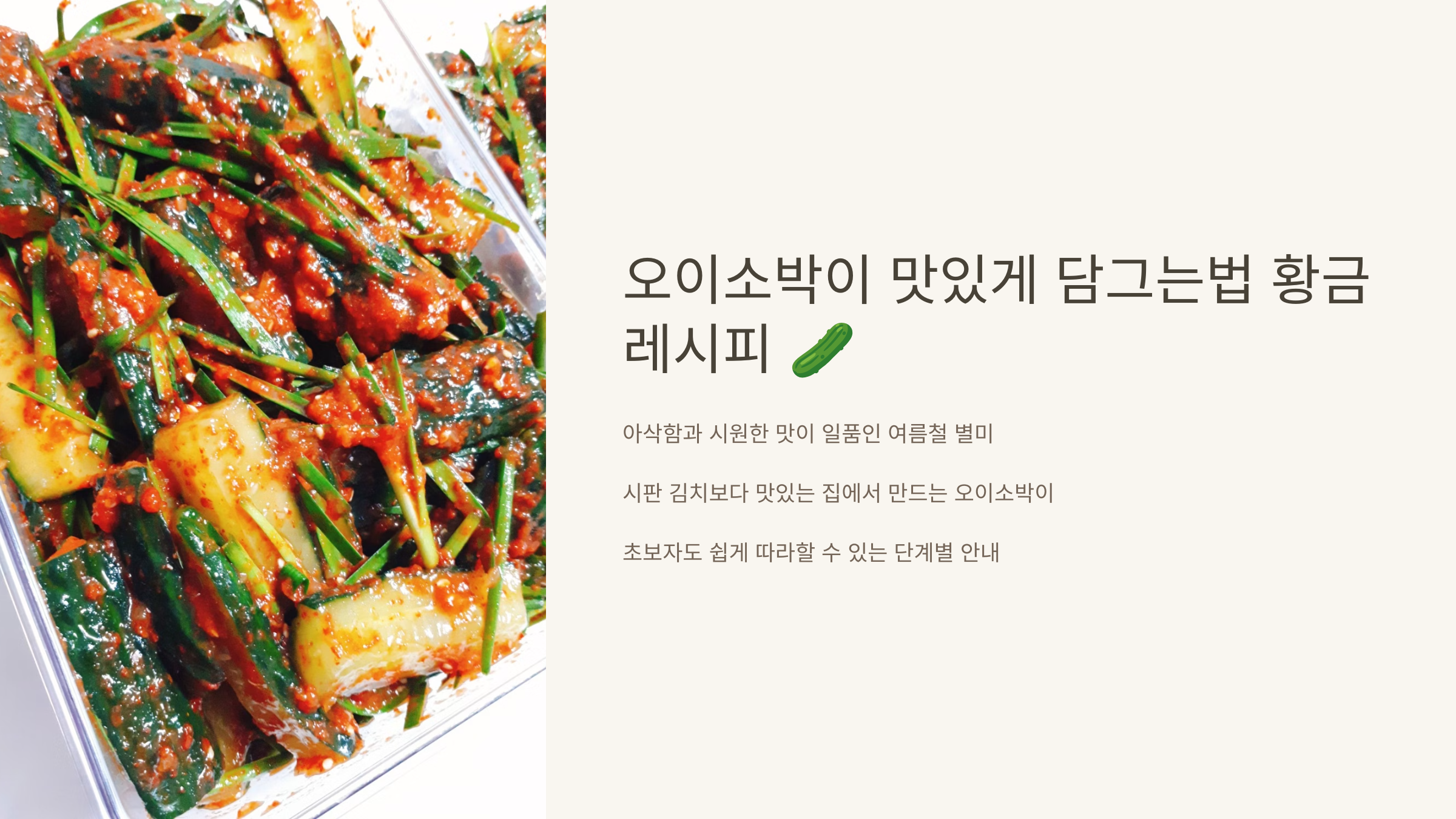 오늘은 집에서 쉽게 따라 할 수 있는 오이소박이 맛있게 담그는법과 황금레시피를 소개합니다. 이 레시피만 따라하면 시판 김치보다 더 맛있는 오이소박이를 만들 수 있어요!