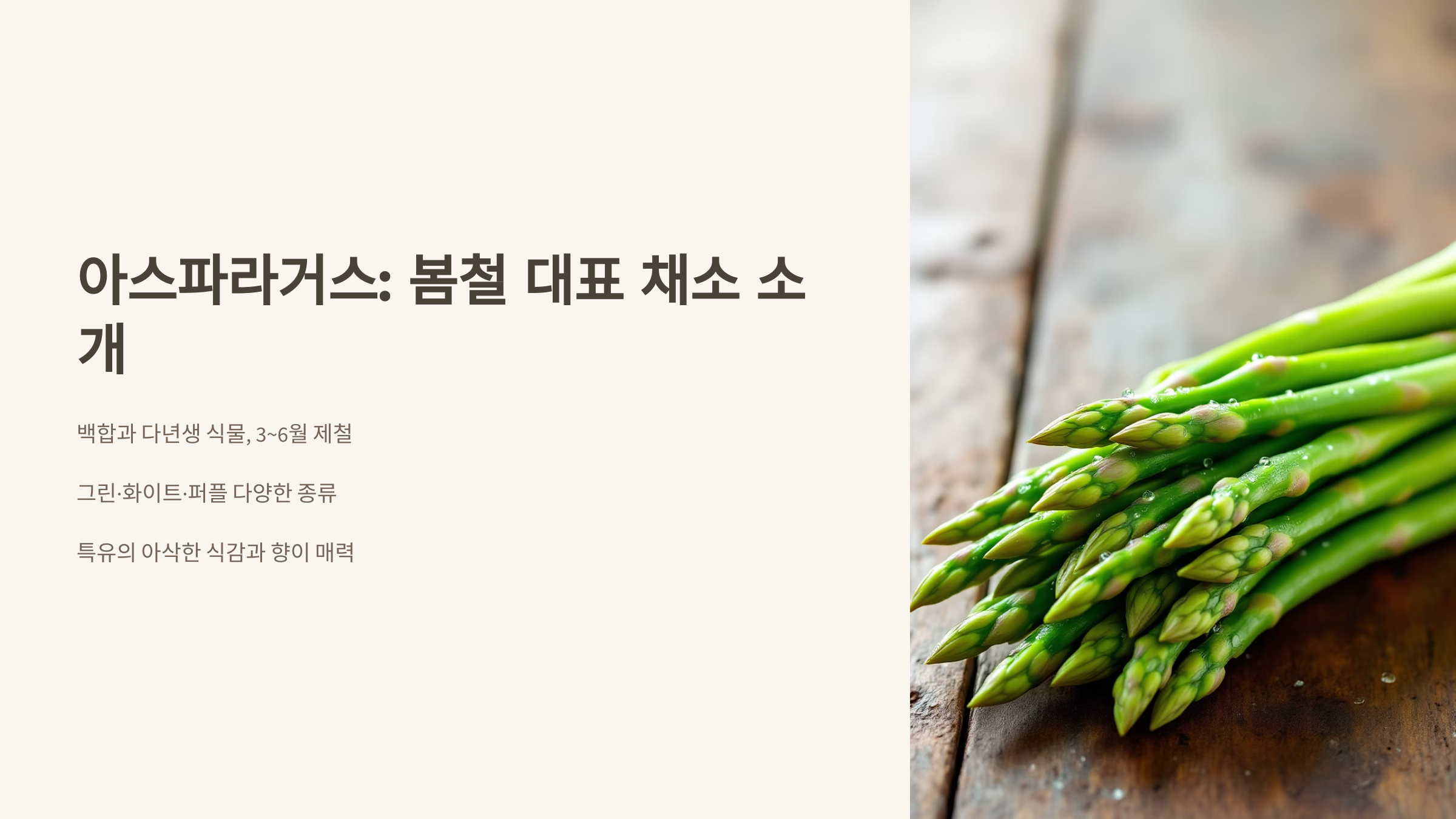 아스파라거스는 봄철 대표 채소로 특유의 향과 아삭한 식감이 매력적인 식재료입니다.