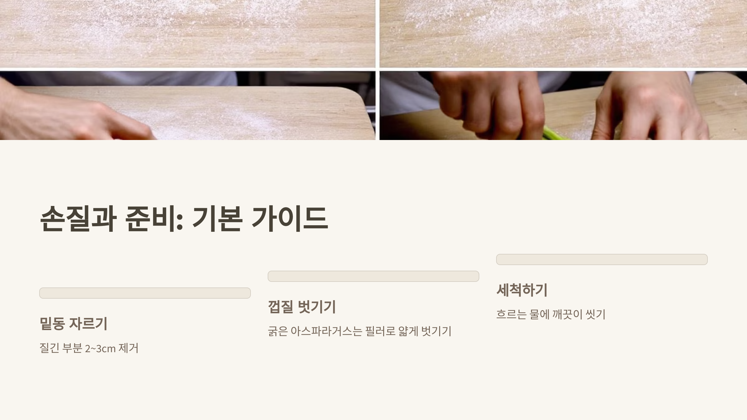 아스파라거스를 맛있게 먹기 위해서는 적절한 손질이 필수입니다. 대부분의 사람들이 어려워하는 부분이지만, 다음 단계를 따라하면 쉽게 손질할 수 있습니다. 올바른 손질은 모든 아스파라거스 요리법의 기본이 됩니다.
