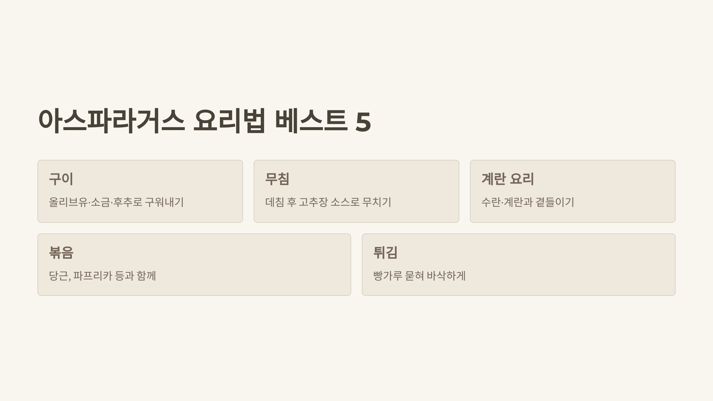 아스파라거스는 다양한 조리법으로 맛있게 즐길 수 있습니다. 아래에서 소개하는 아스파라거스 요리법 5가지를 통해 가정에서도 맛있는 아스파라거스 요리를 쉽게 만들어 보세요.