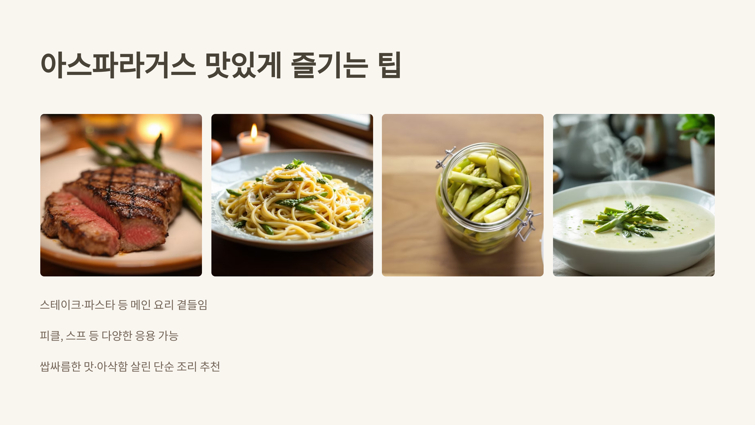 신선한 아스파라거스를 고르는 법부터 다양한 요리법까지, 이 글이 여러분의 아스파라거스 요리에 도움이 되길 바랍니다. 건강하고 맛있는 아스파라거스 요리로 가족의 입맛과 건강을 모두 만족시켜 보세요! 🥦✨