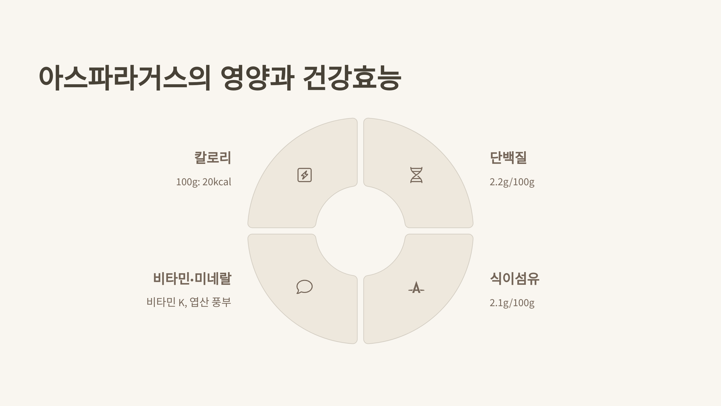 아스파라거스에 풍부한 아스파라긴산은 이뇨 작용을 돕고, 루틴 성분은 모세혈관을 강화하는 효과가 있습니다. 또한 항산화 성분이 풍부해 노화 방지에도 도움이 됩니다. 이런 훌륭한 영양소를 가진 아스파라거스를 다양한 아스파라거스 요리법으로 활용해 보세요.
