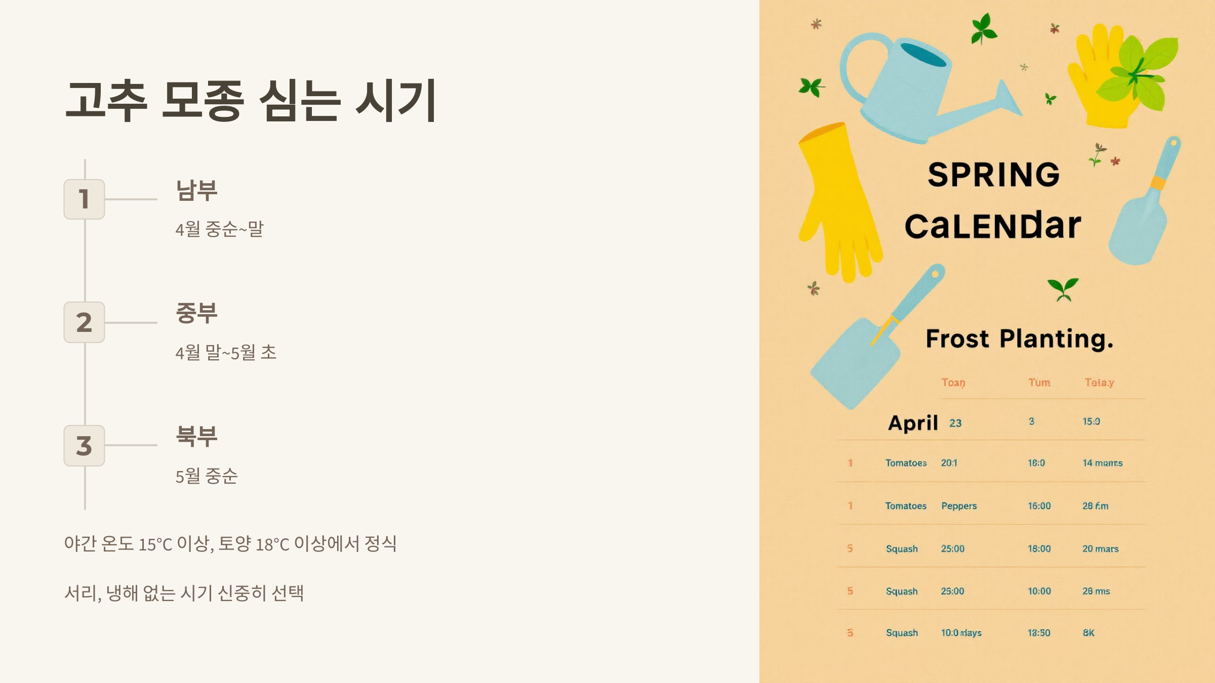 고추 모종을 심는 시기는 지역에 따라 차이가 있지만, 일반적으로 늦서리가 지난 후가 적기입니다. 고추는 추위에 약하기 때문에 서리 위험이 완전히 지난 후에 심어야 합니다.