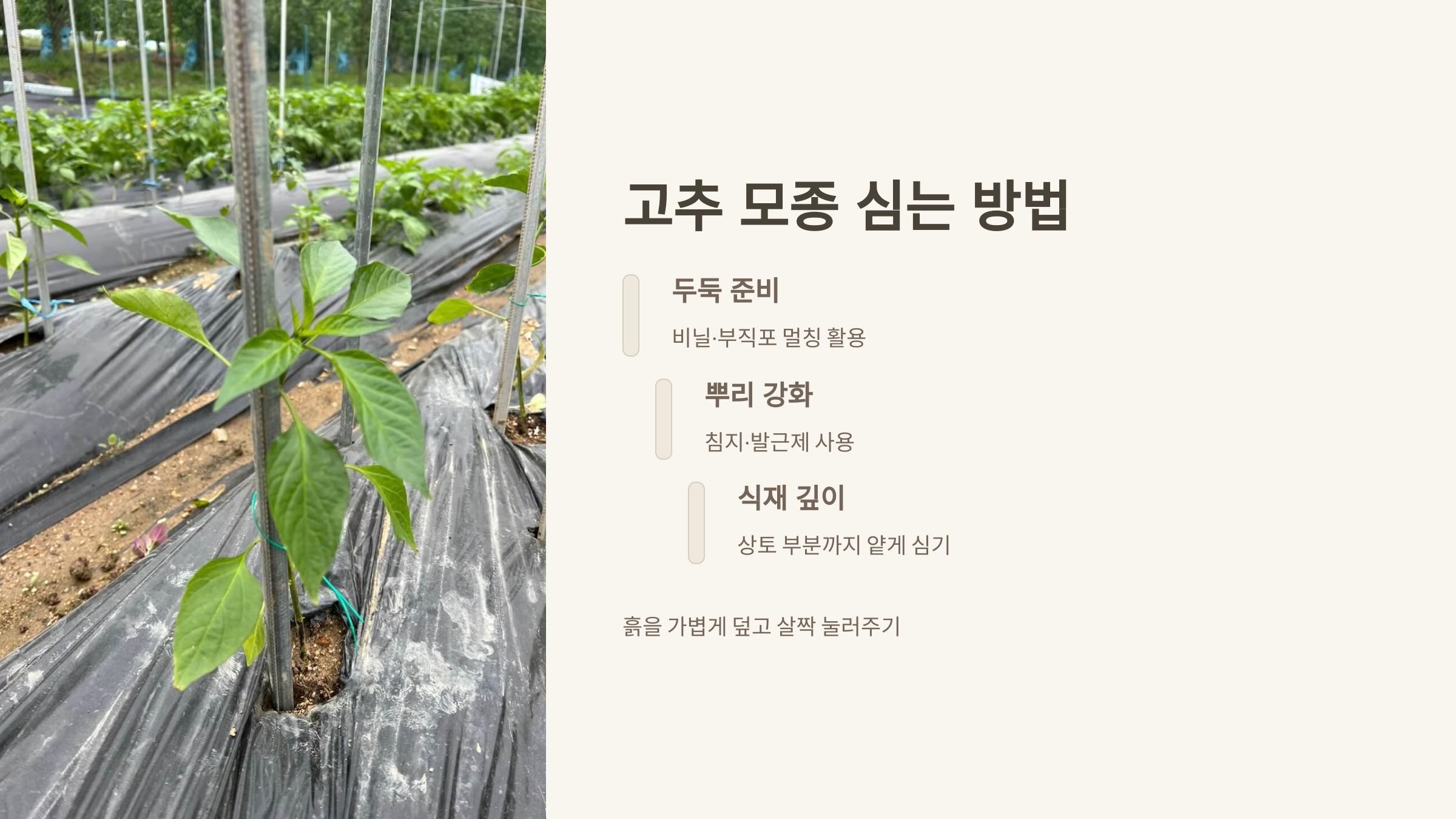 고추 모종을 심는 방법은 성공적인 재배의 기초가 됩니다. 아래 단계별 과정을 따라 심으면 고추 모종의 활착률을 높일 수 있습니다.