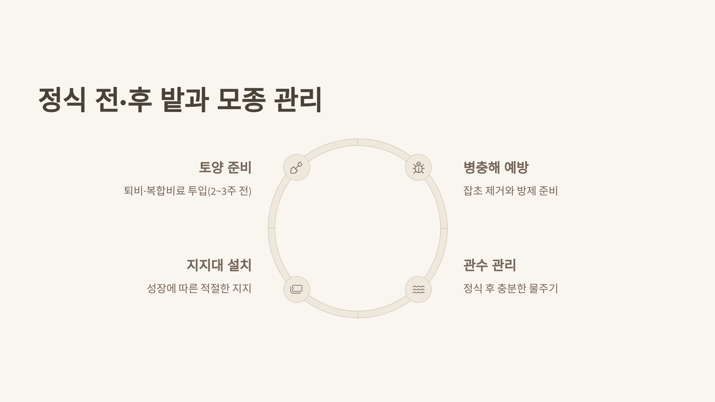 • 심기 전 모종에 충분히 물을 주어 뿌리 손상을 줄이세요.