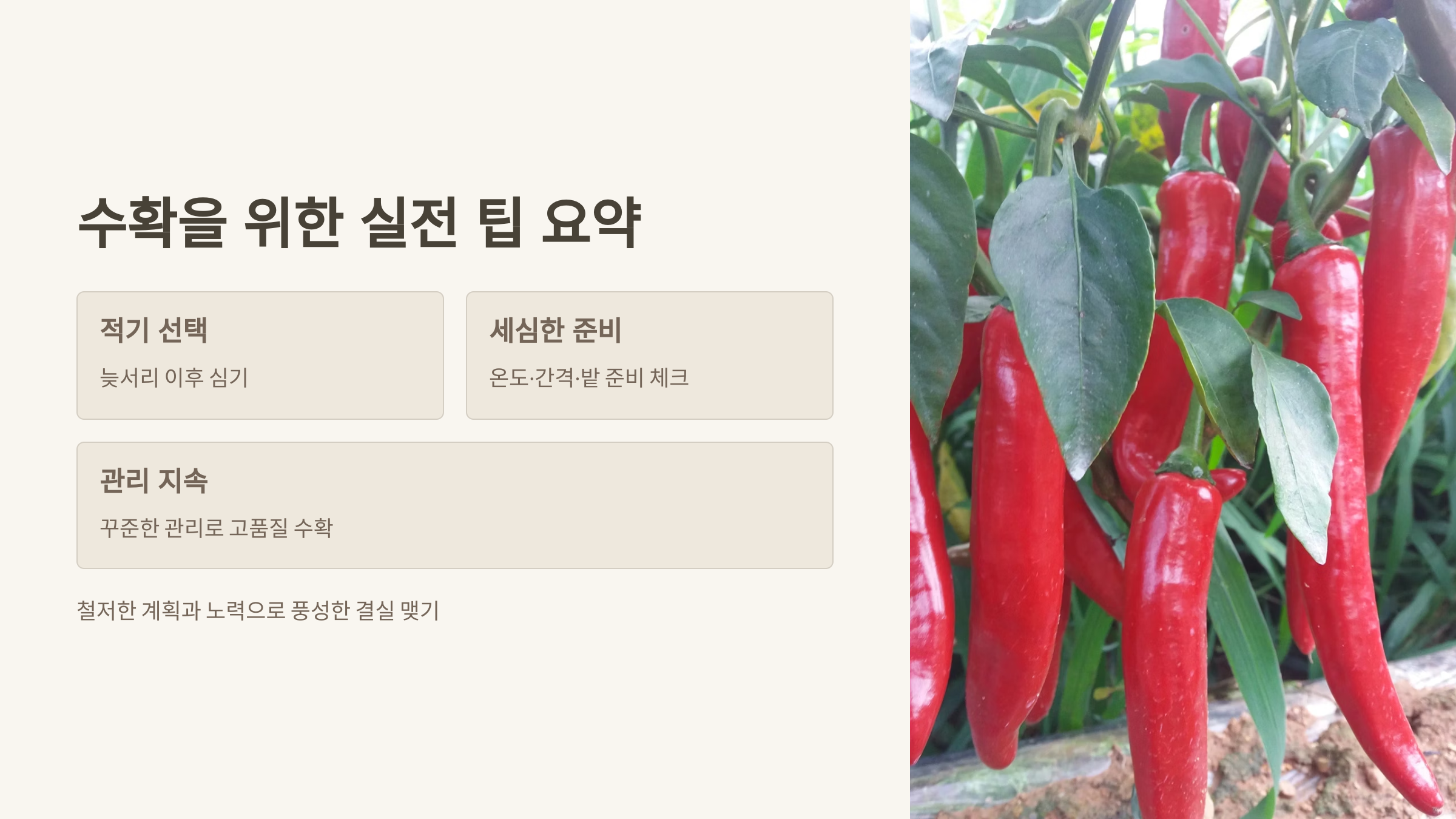 이제 여러분도 이 가이드를 참고하여 맛있는 고추를 직접 재배해보세요. 자신만의 텃밭에서 기른 신선한 고추로 만드는 요리는 특별한 만족감을 선사할 것입니다. 행운을 빕니다! 🍀