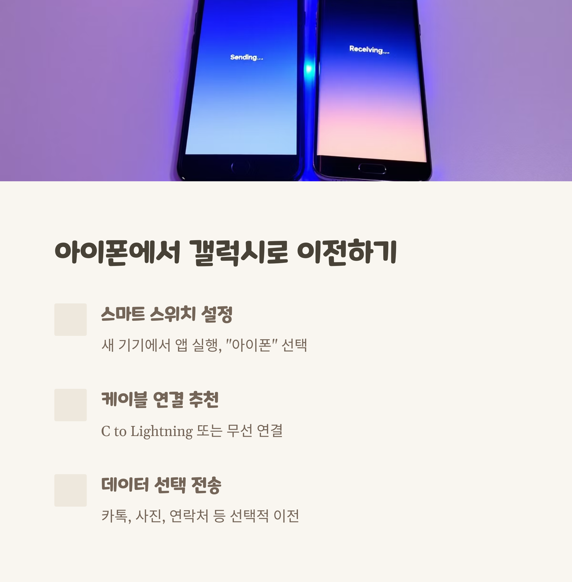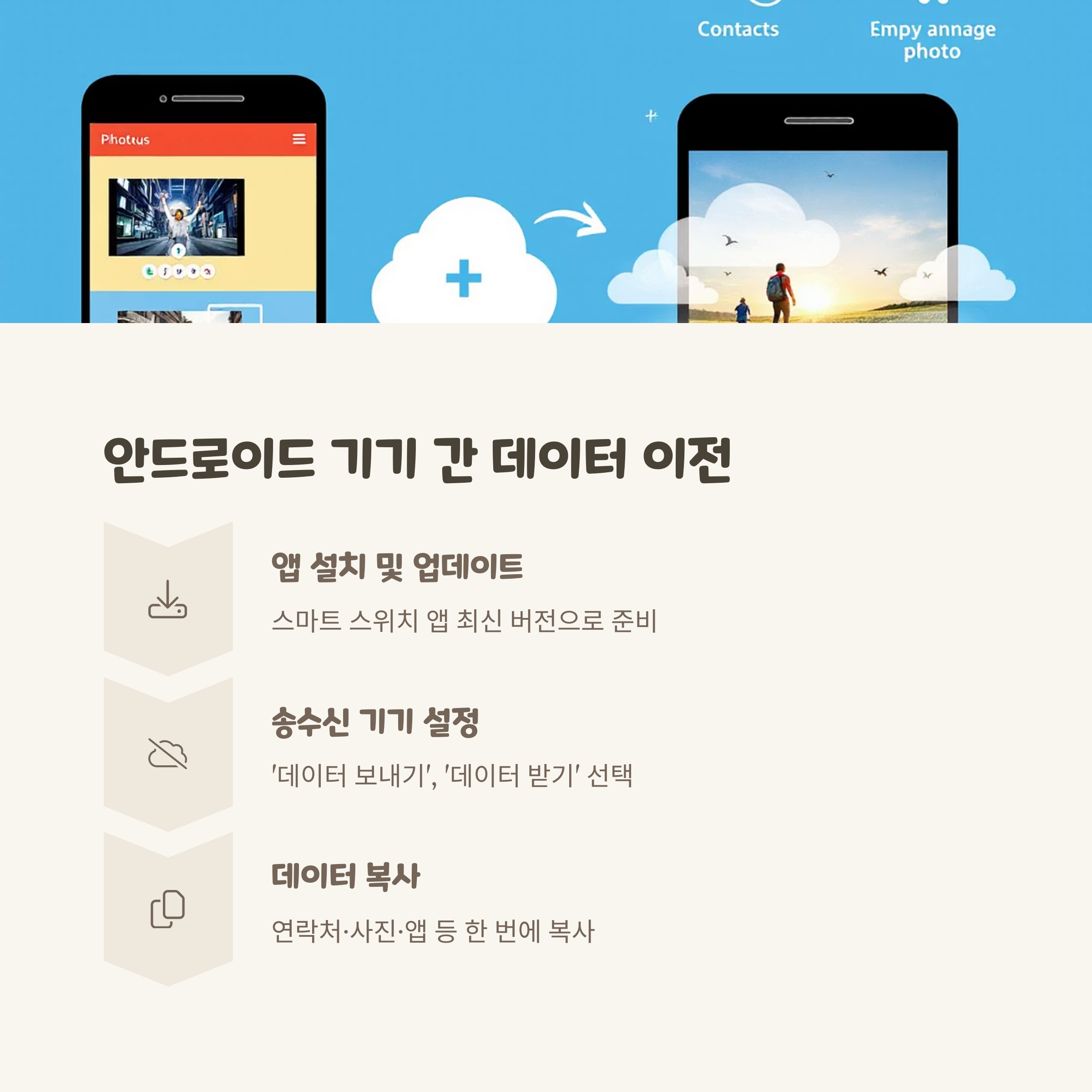 - 제조사별 앱 활용: 삼성 Smart Switch, 구글 픽셀 전환 도구 등