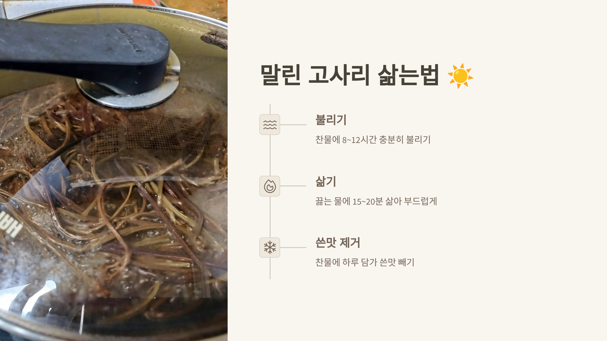 말린 고사리의 쓴맛이 걱정된다면, 첫 번째 삶은 물을 버리고 새 물에 다시 한번 삶아주세요. 베이킹소다를 아주 소량(물 2리터당 1/2작은술) 넣어 삶으면 쓴맛이 더 잘 제거됩니다. 단, 소다를 너무 많이 넣으면 식감이 물러지니 주의하세요!