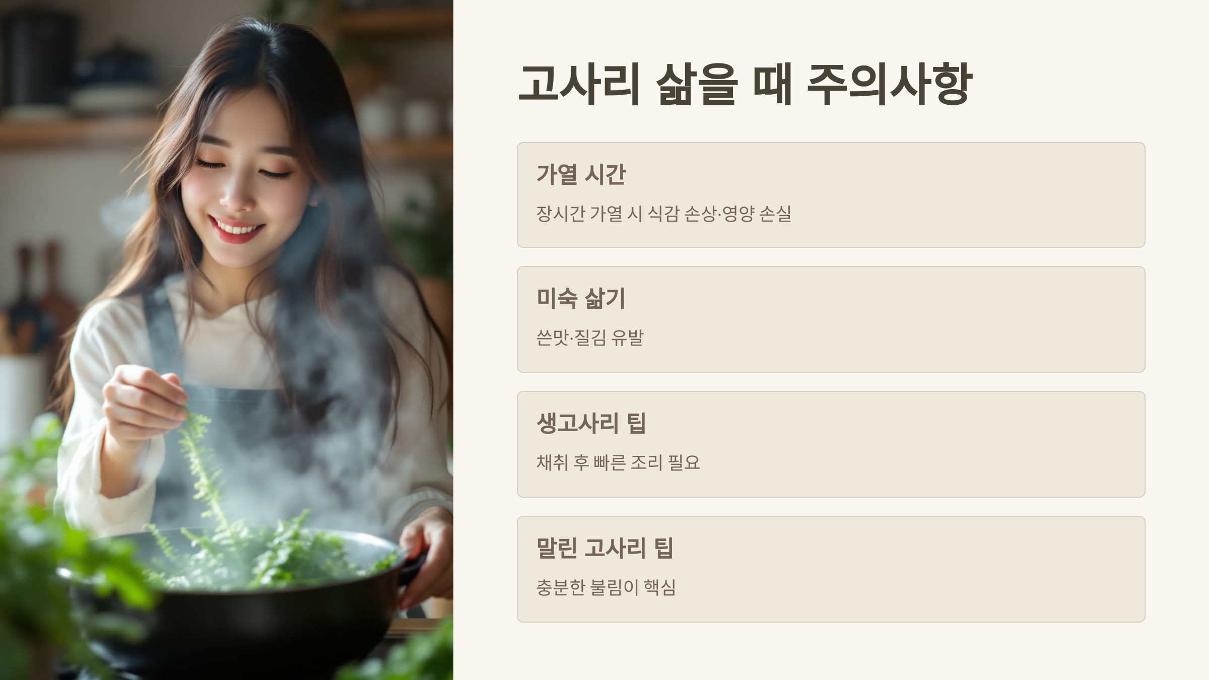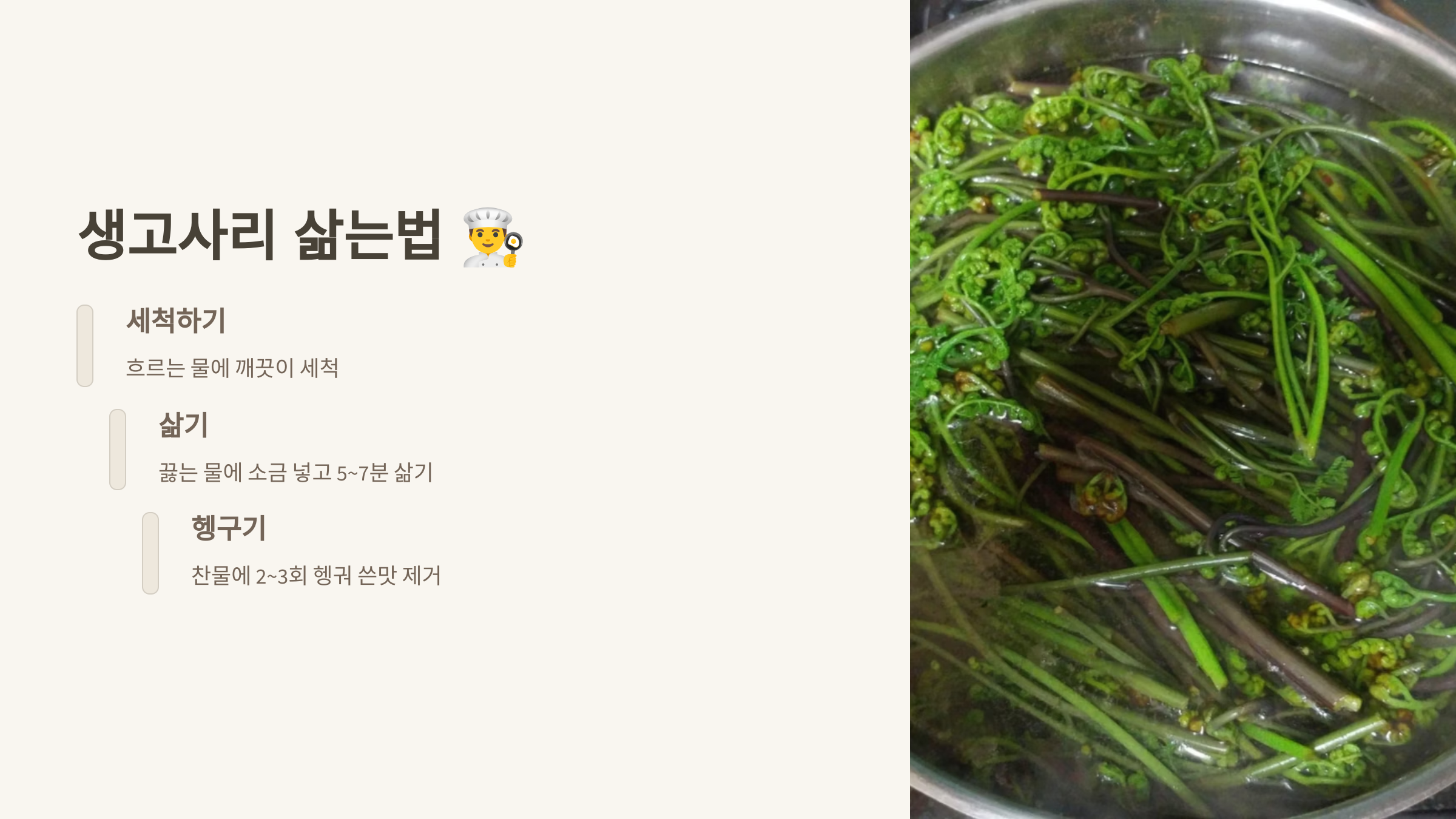 생고사리를 삶을 때는 소금물에 적당히 데치는 것이 중요합니다. 너무 오래 삶으면 영양소가 파괴되고 식감이 물러지므로 주의하세요.