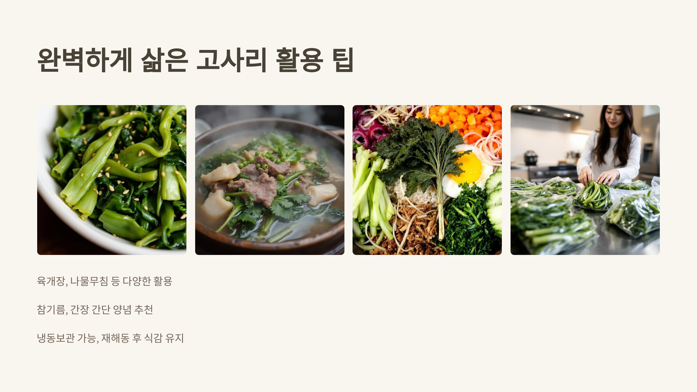 고사리는 다양한 요리에 활용할 수 있으며, 특유의 식감과 풍미로 어떤 요리든 한층 더 맛있게 만들어줍니다. 고사리 삶는법을 제대로 익혀 건강하고 맛있는 한식 요리를 즐겨보세요!
