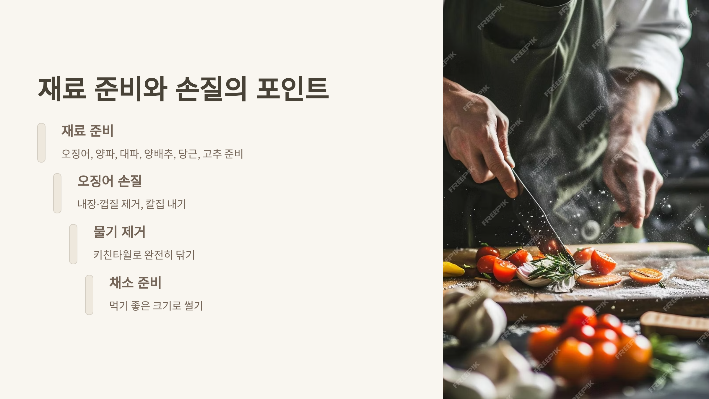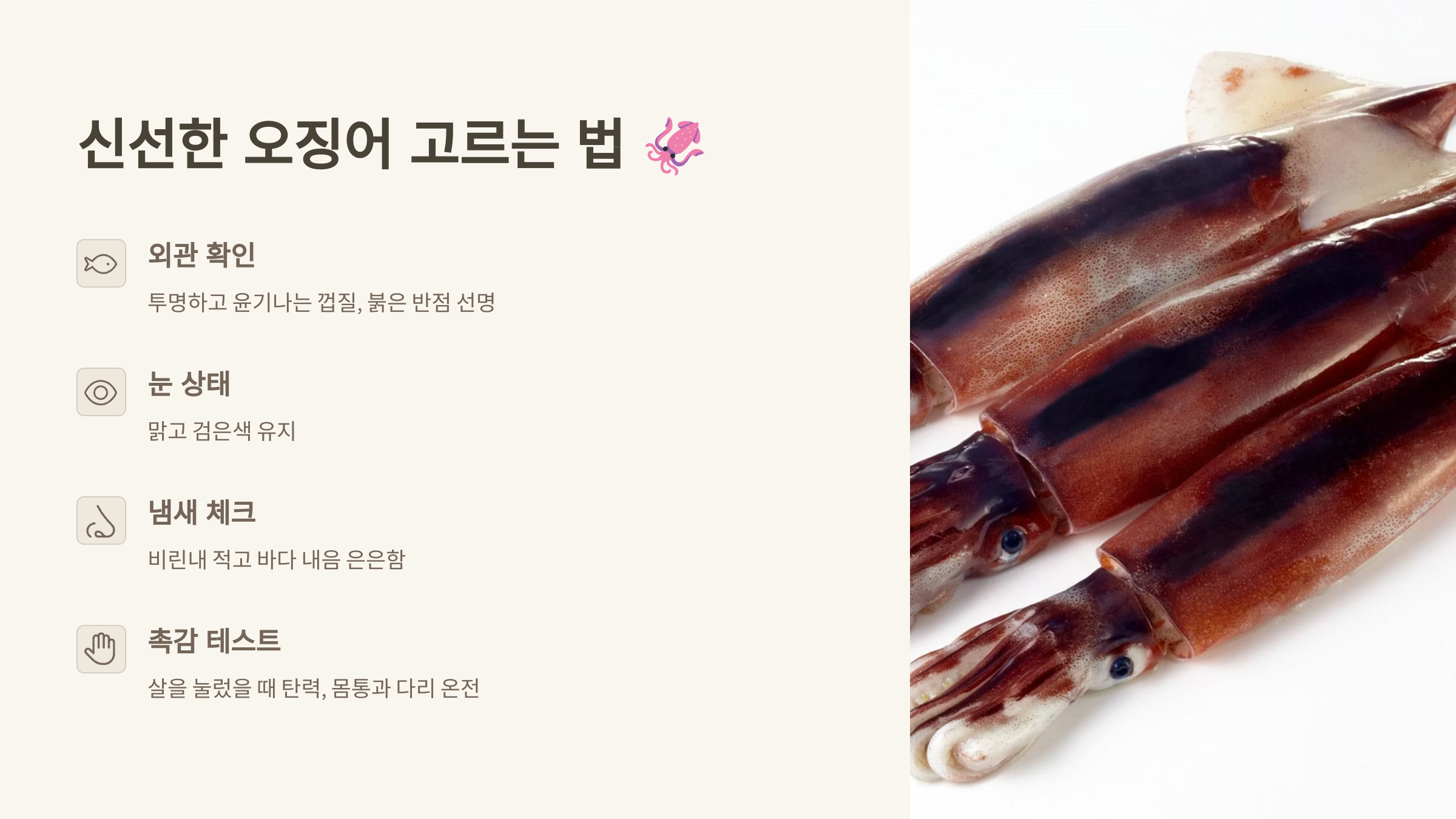 🔍 오징어 구입 TIP: 냉동 오징어를 사용할 경우, 급속냉동된 제품을 선택하고 해동할 때는 천천히 냉장고에서 6~8시간 정도 자연 해동하는 것이 식감을 유지하는 비결입니다. 절대로 전자레인지나 뜨거운 물에 담가 급속 해동하지 마세요!
