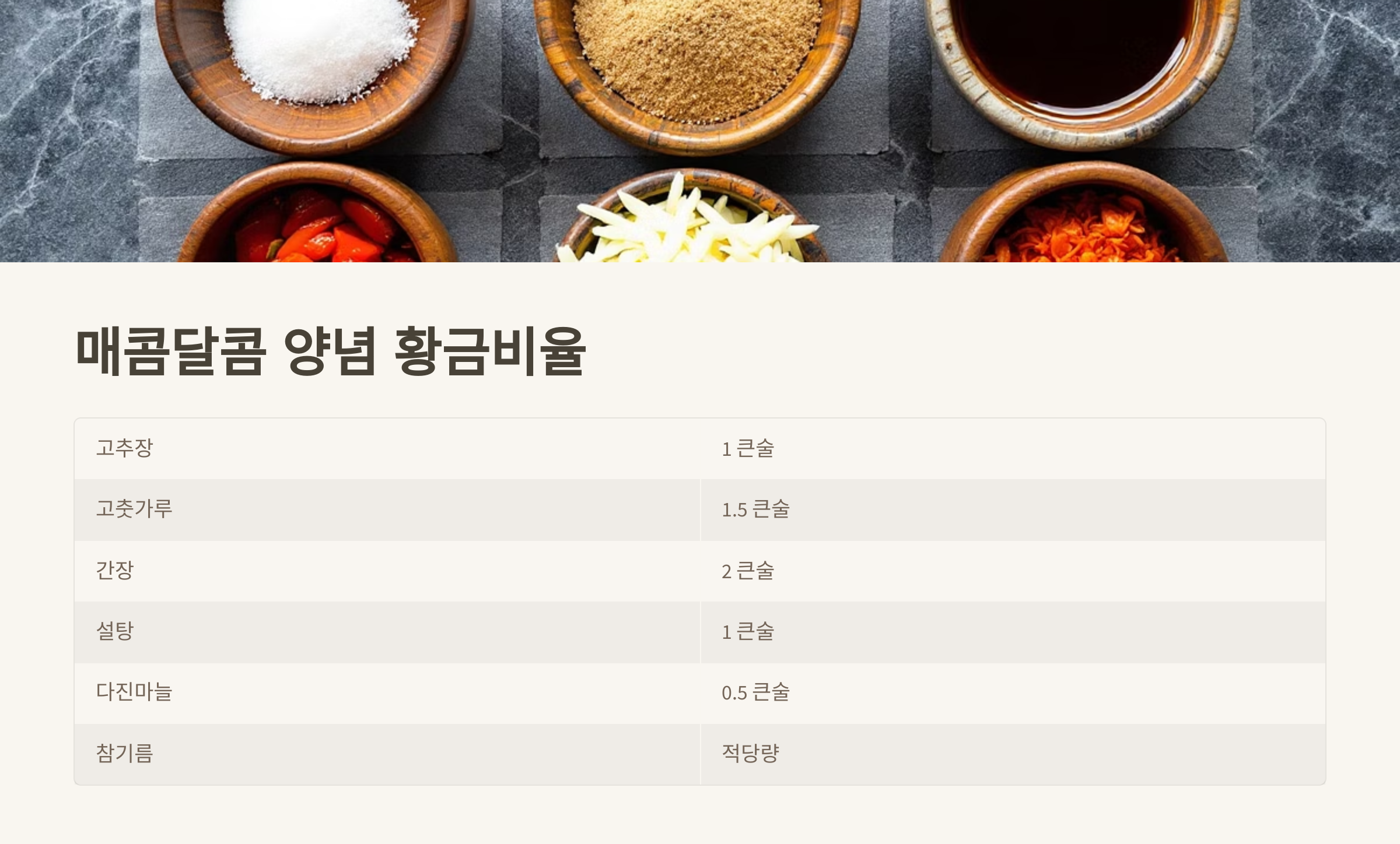 - 양념장: 고추장 2큰술, 고춧가루 1큰술, 간장 1큰술, 설탕 1큰술, 다진 마늘 1큰술, 참기름 1작은술, 올리고당 1작은술, 맛술 1큰술