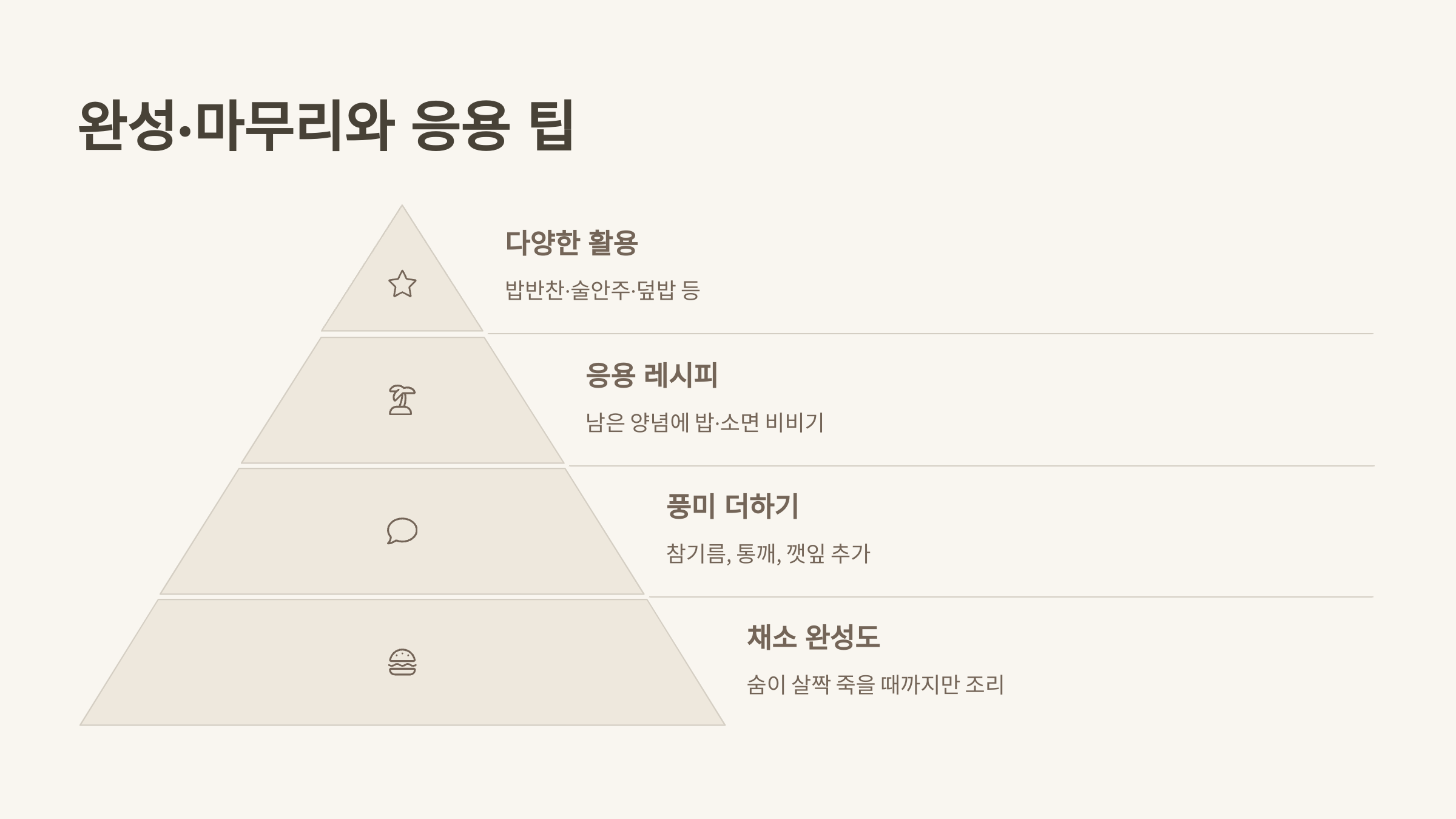 - 양념 넣고 완성: 양념장을 넣고 30초~1분 정도만 더 볶아 완성합니다.