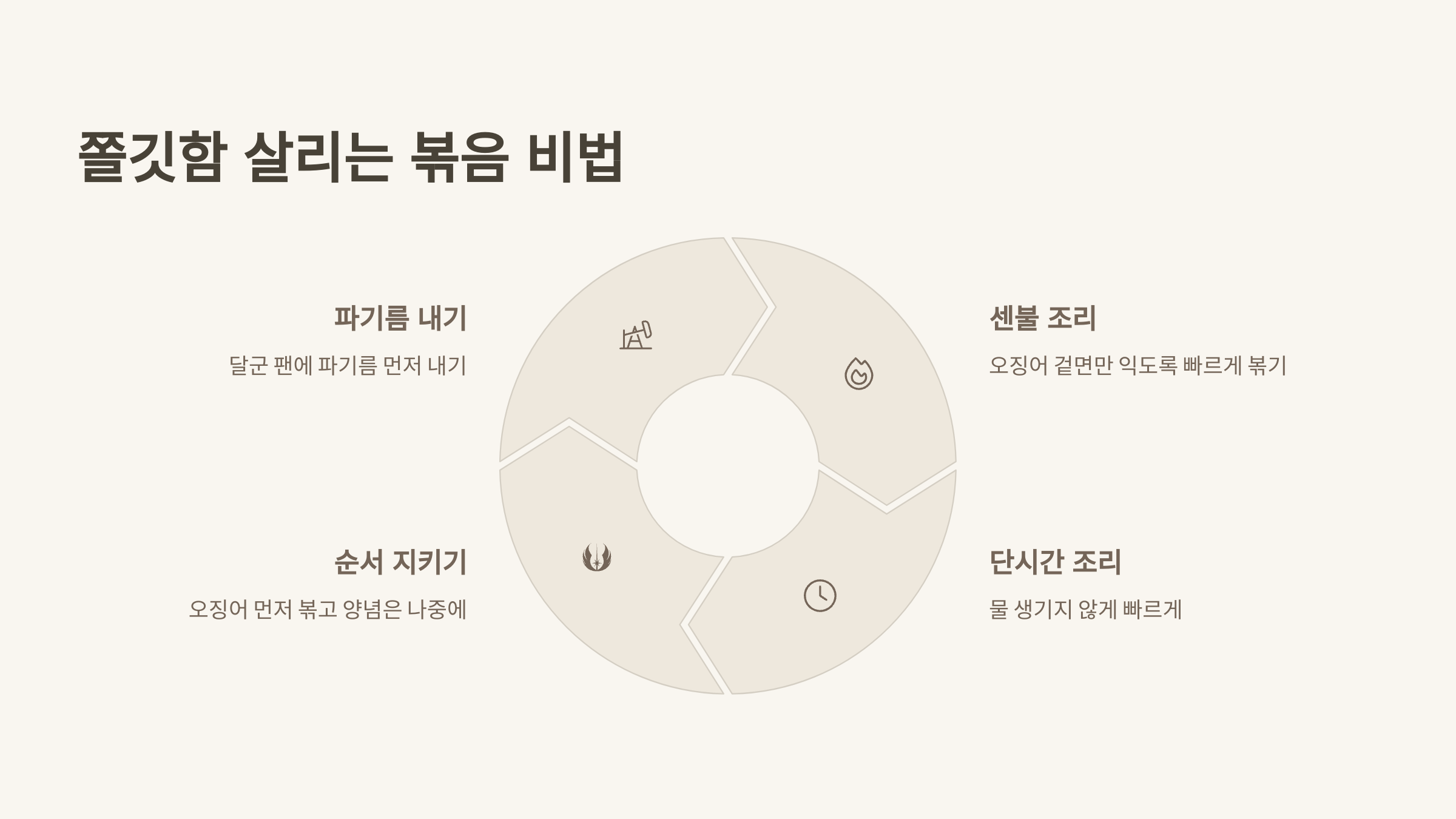 - 오징어 볶기: 오징어는 마지막에 넣어 1분 이내로 빠르게 볶아야 질기지 않습니다.
