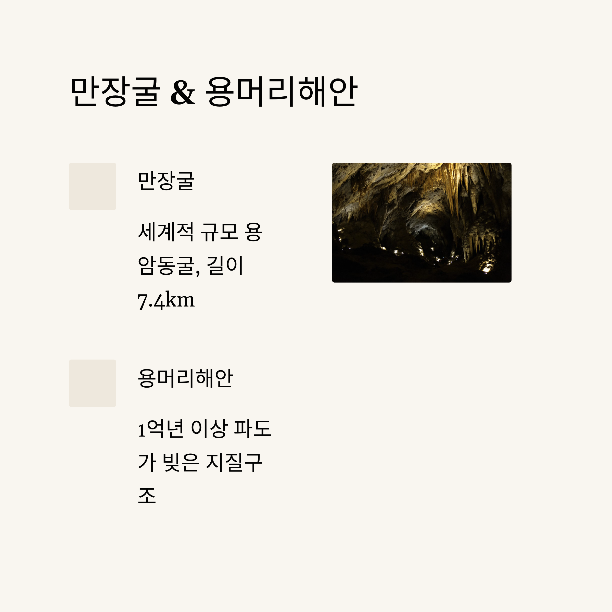 - 주의사항: 동굴 내부는 연중 11-13℃, 따뜻한 옷 준비 필요