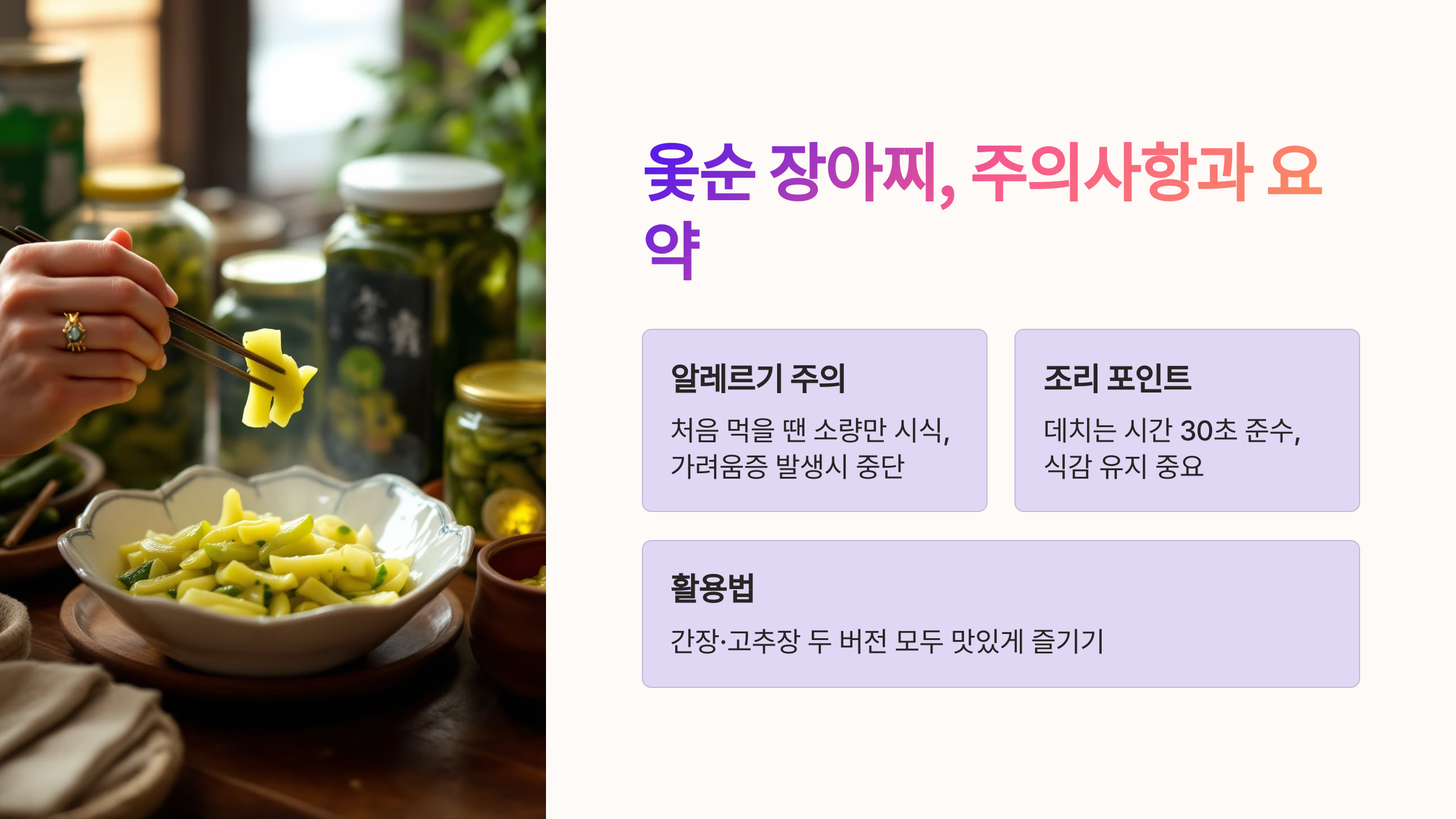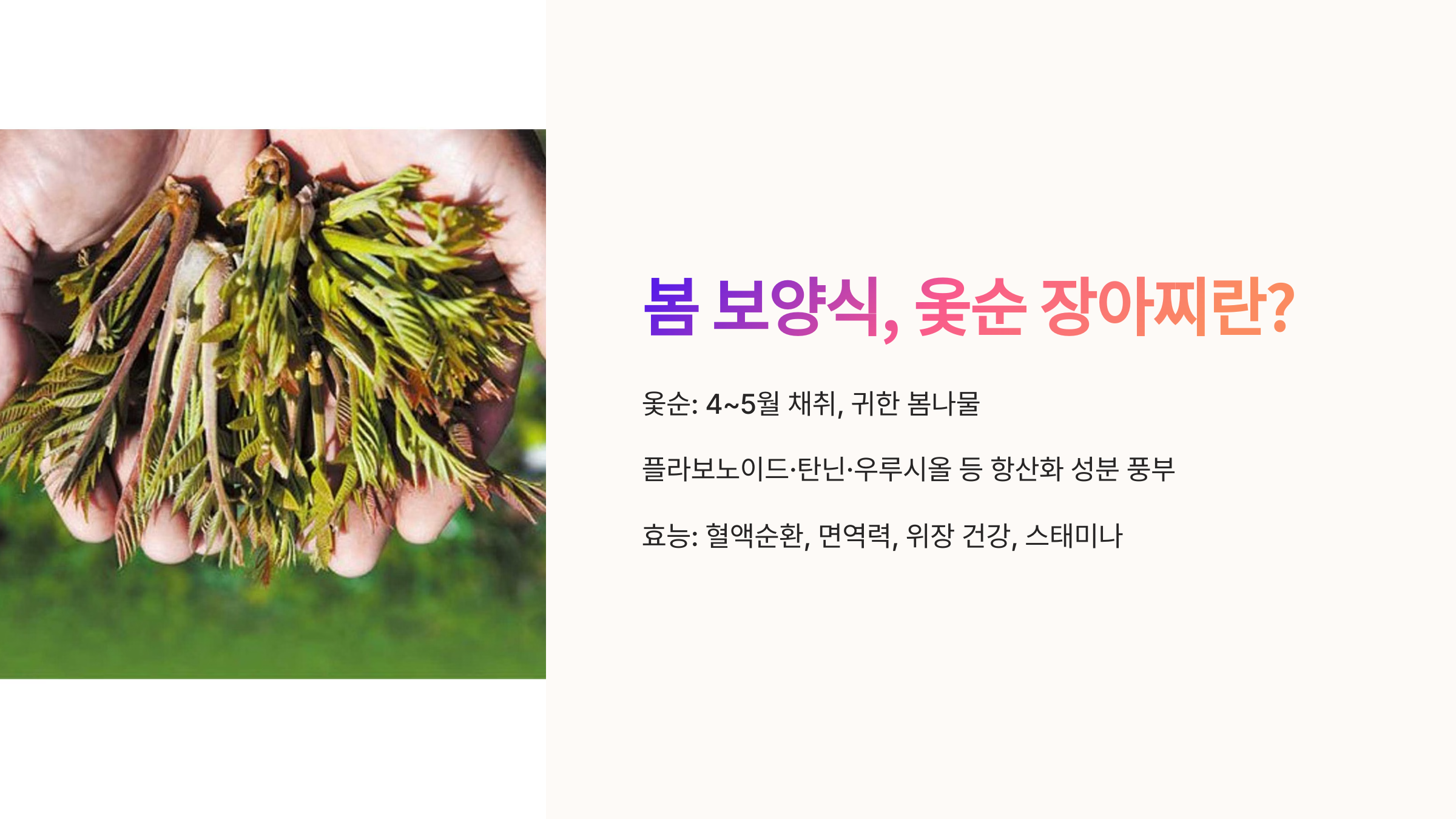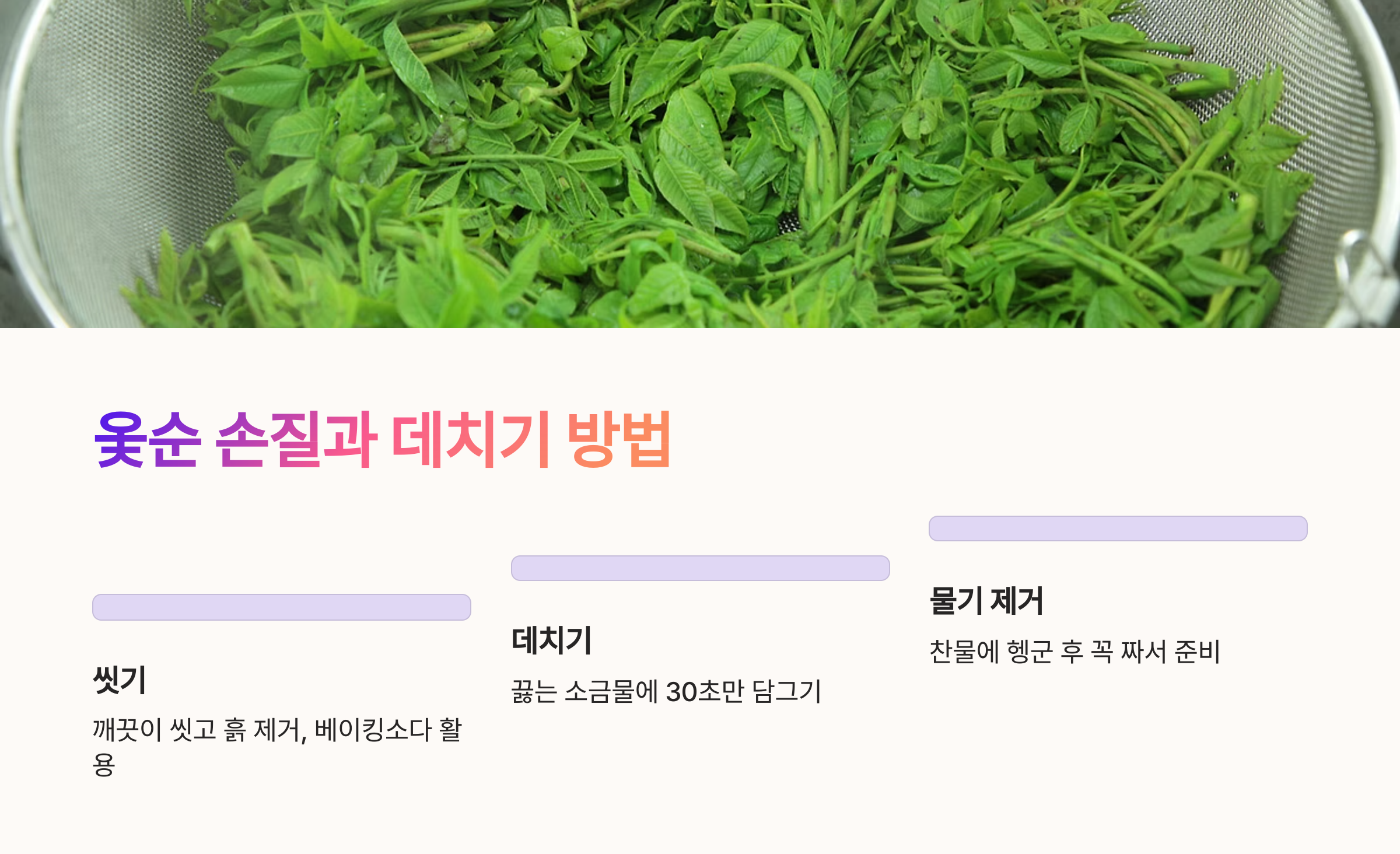 💡 TIP: 옻순을 처리할 때는 반드시 장갑을 착용하고, 충분히 데치는 과정을 거쳐야 안전하게 먹을 수 있습니다. 옻에 알레르기가 있는 분들은 섭취에 주의하세요.