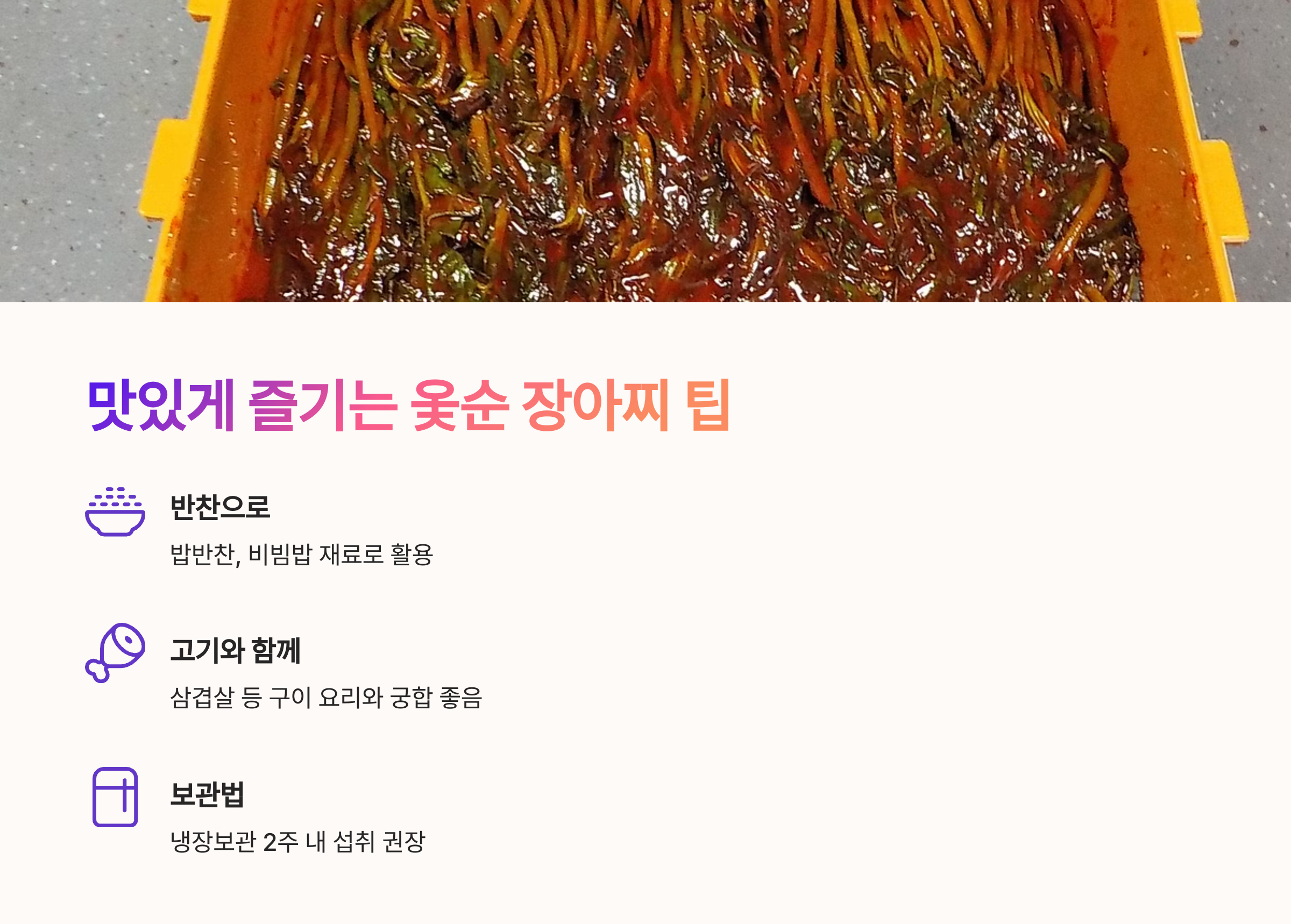 - 고추장 장아찌는 냉장 보관 시 2~3주, 간장 장아찌는 1~2개월까지 보관 가능합니다.