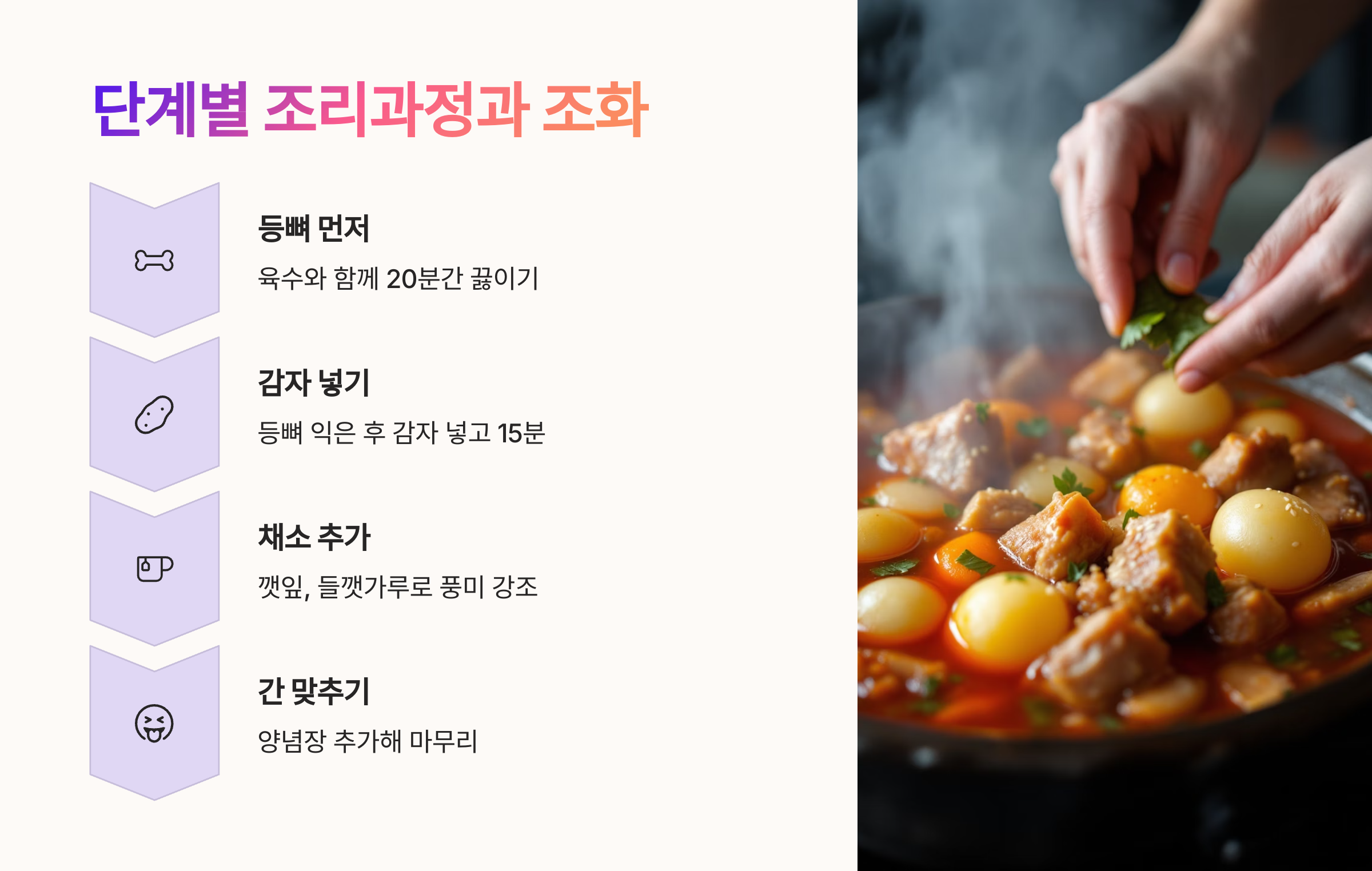 🔍 전문가의 한마디: 진정한 감자탕 황금레시피의 비밀은 '시간'입니다. 등뼈를 충분히 오래 끓여야 뼈에서 깊은 맛이 우러나옵니다. 최소 1시간 30분 이상 끓여주는 것이 맛있는 감자탕 만드는법의 핵심입니다.