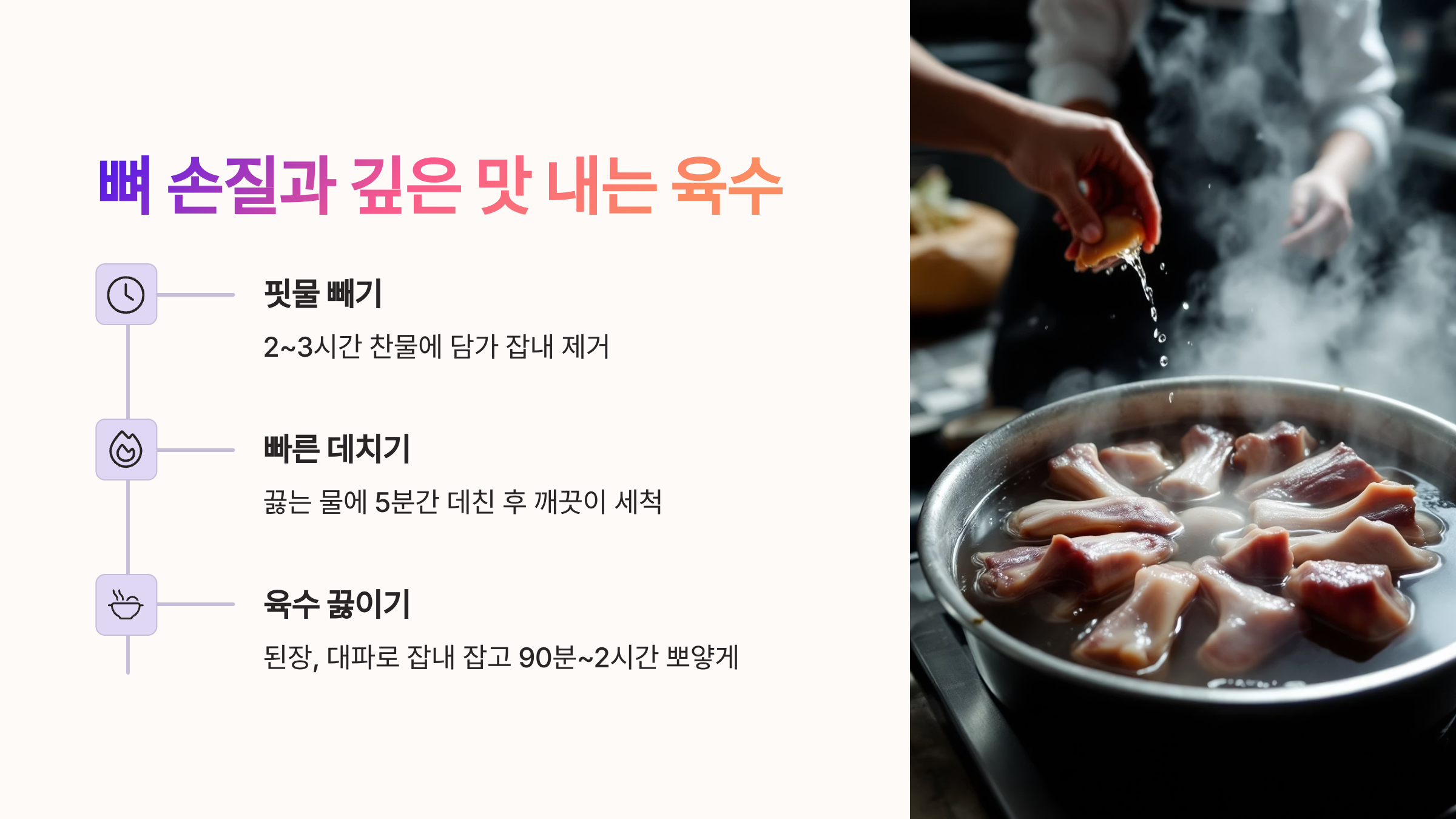 ⏱️ 시간 단축 팁: 압력솥을 사용하면 육수 우리는 시간을 30~40분으로 단축할 수 있습니다. 하지만 가능하다면 일반 냄비에서 서서히 끓이는 것이 더 깊은 맛을 내는 감자탕 황금레시피의 비결입니다.