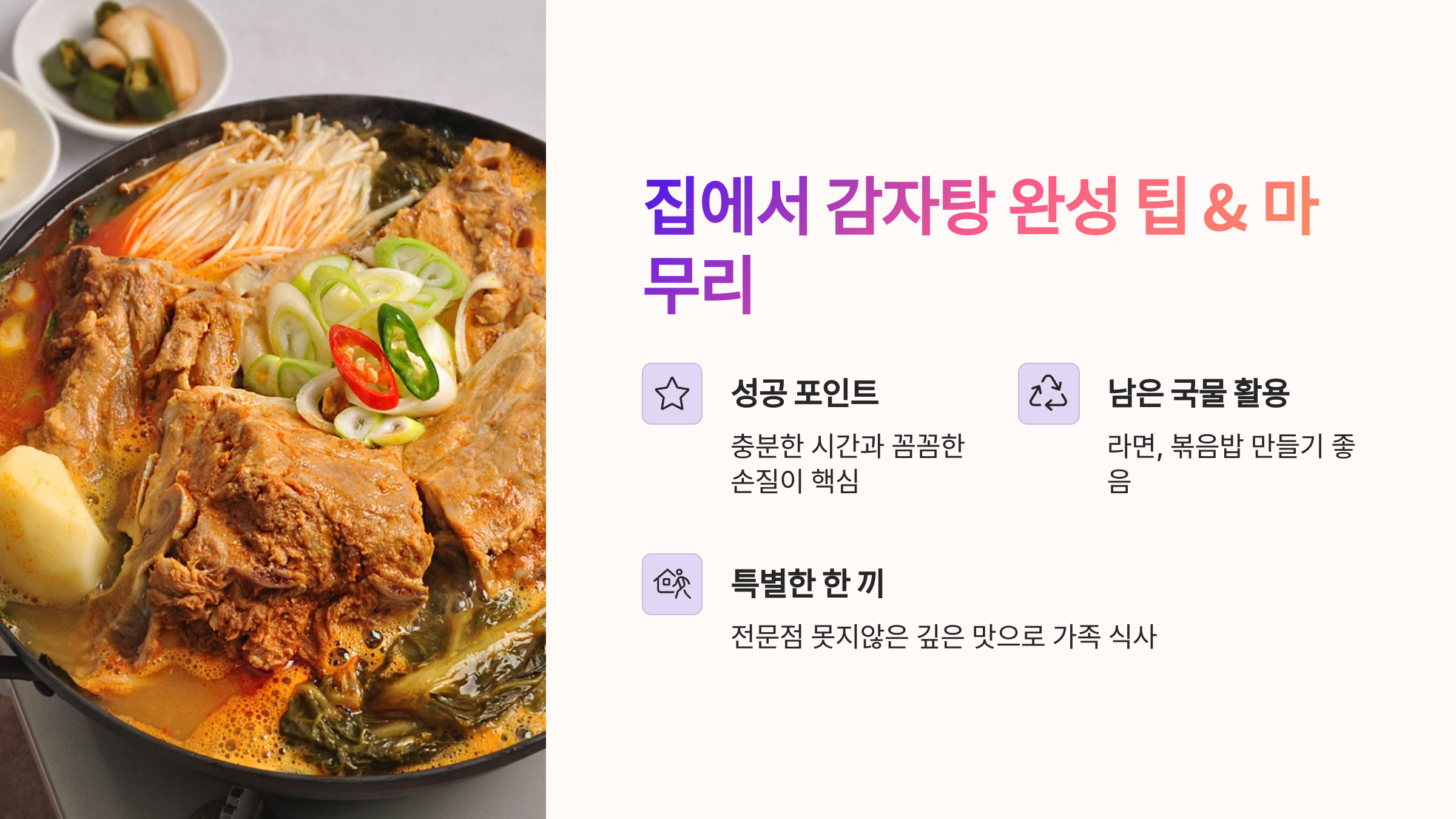🔍 전문가의 한마디: 진정한 감자탕 황금레시피의 비밀은 '시간'입니다. 등뼈를 충분히 오래 끓여야 뼈에서 깊은 맛이 우러나옵니다. 최소 1시간 30분 이상 끓여주는 것이 맛있는 감자탕 만드는법의 핵심입니다.