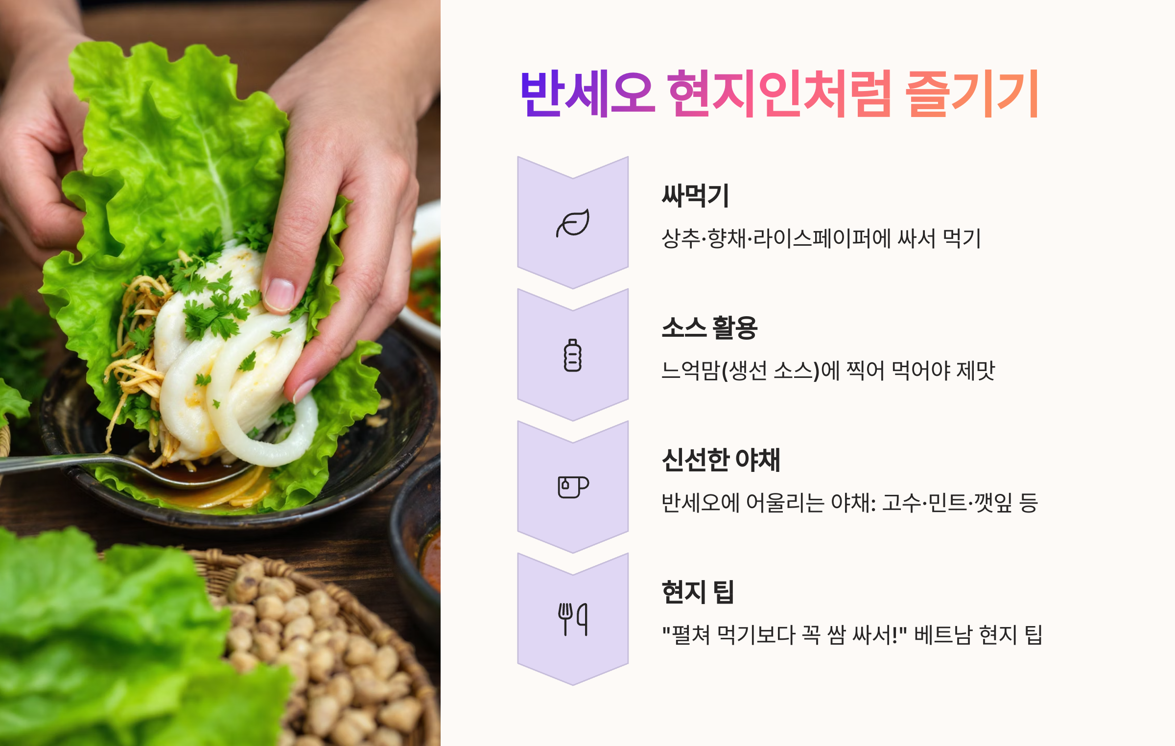 반세오를 맛있게 먹으려면 현지인들처럼 먹는 것이 좋습니다. 바삭한 반세오를 적당한 크기로 자른 후, 신선한 상추나 깻잎으로 싸서 각종 허브와 함께 먹습니다. 여기에 향긋한 넘짱 소스를 찍어 먹으면 식감과 맛의 조화를 완벽하게 즐길 수 있습니다.