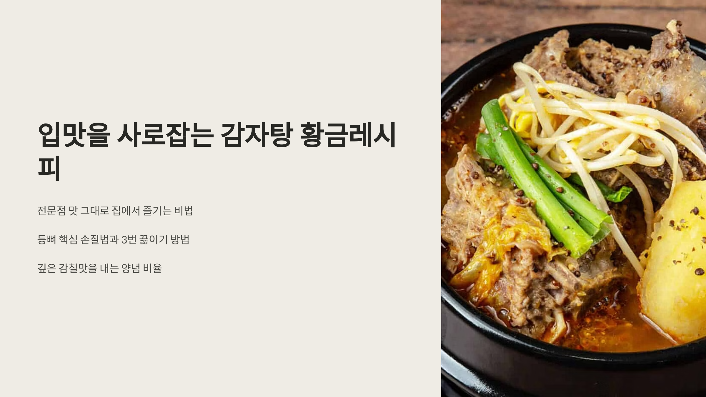 집에서도 맛집 감자탕을 즐길 수 있는 비법을 소개합니다. 뼈에서 우러나오는 깊은 맛과 감칠맛 나는 양념, 그리고 감자의 조화가 일품인 감자탕 황금레시피로 가족의 입맛을 사로잡아보세요!