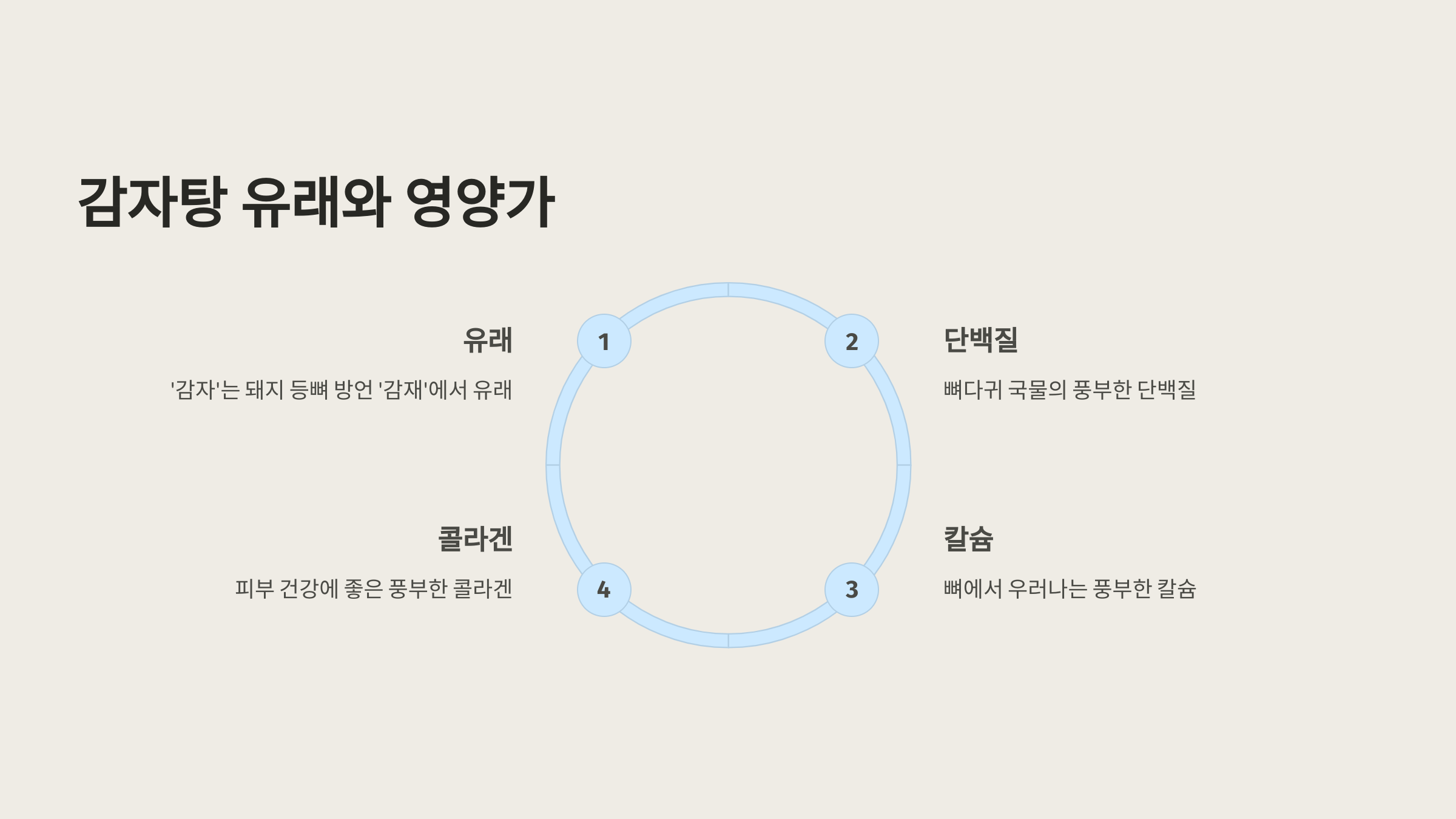 감자탕은 단백질과 칼슘이 풍부한 뼈다귀 국물에 비타민과 미네랄이 풍부한 채소를 더해 영양 균형이 뛰어난 음식입니다. 특히 돼지 등뼈에 함유된 콜라겐은 피부 건강에도 좋습니다.