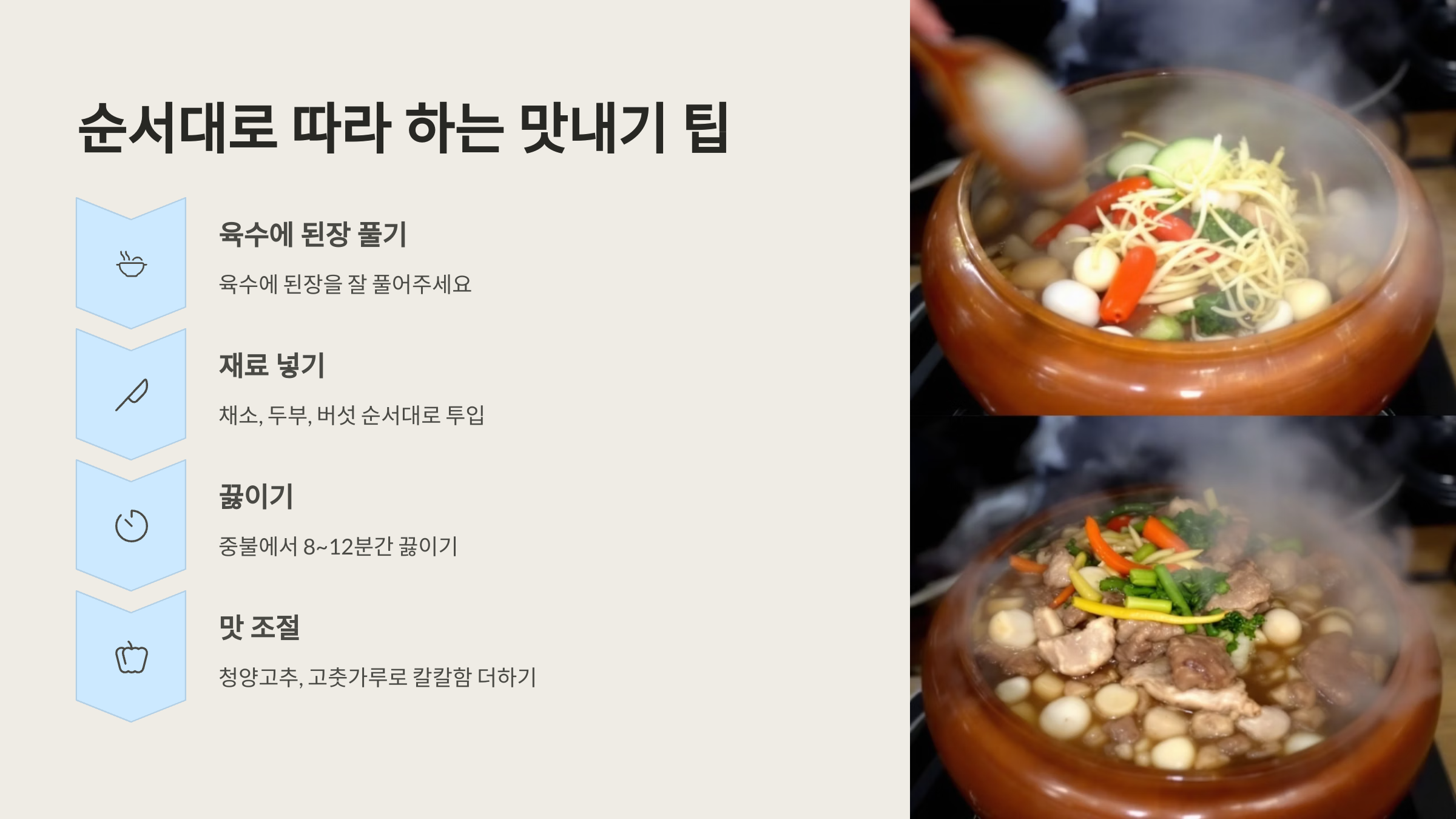 올바른 순서와 비법을 알면 된장찌개의 맛이 확연히 달라집니다. 아래는 단계별 된장찌개 끓이는 방법입니다.