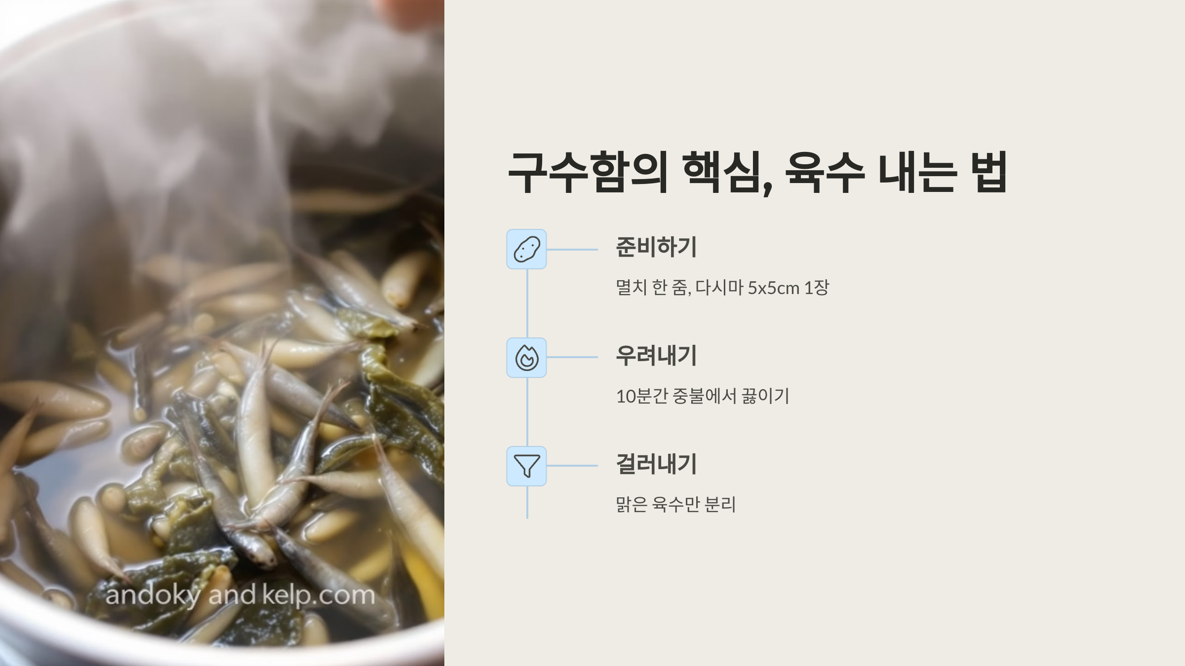 - 육수 만들기: 위에서 설명한 방법으로 육수를 준비합니다.