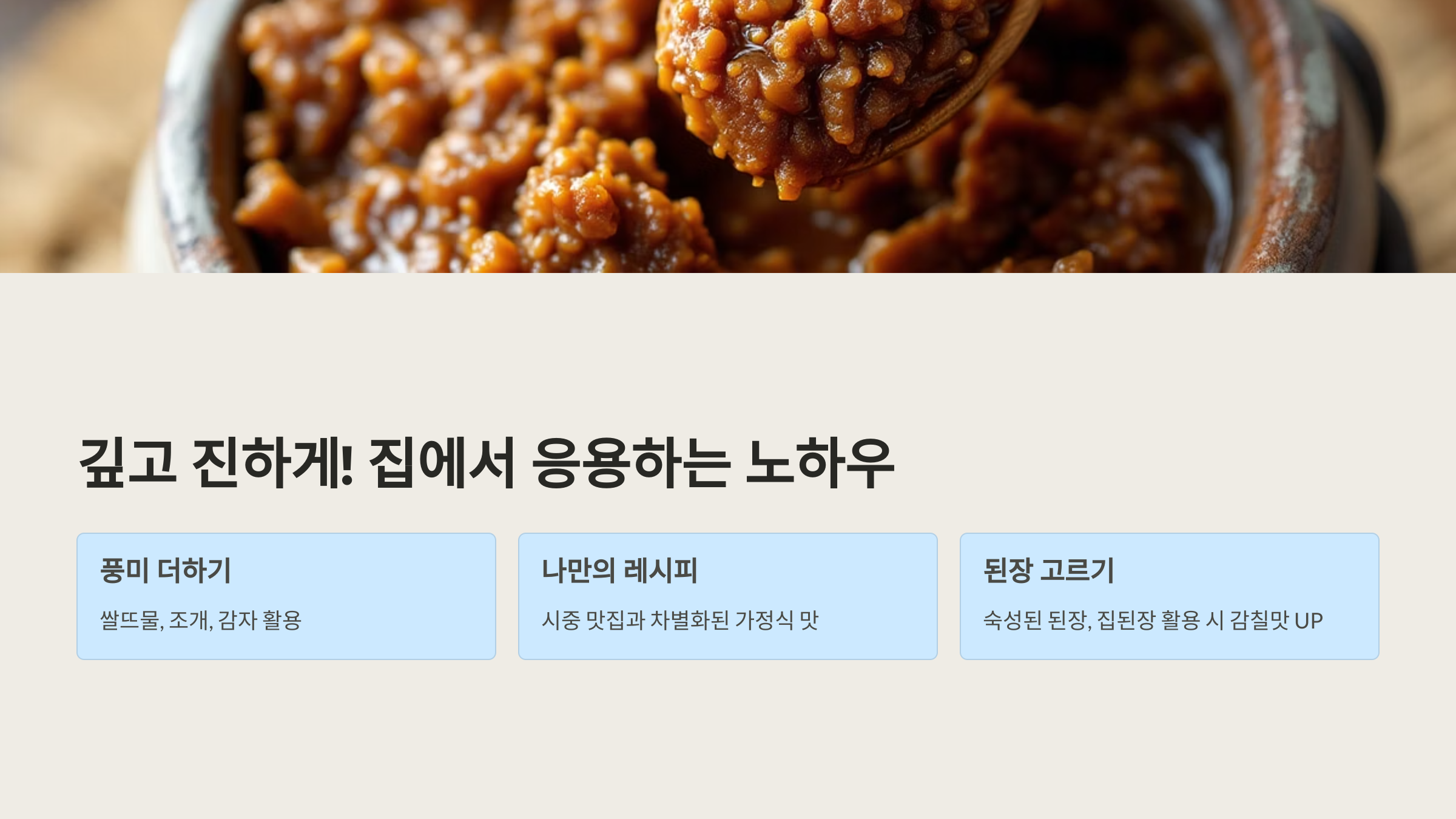 - 숙성된 된장 사용: 가능하면 1년 이상 숙성된 된장을 사용하면 깊은 맛을 낼 수 있습니다.