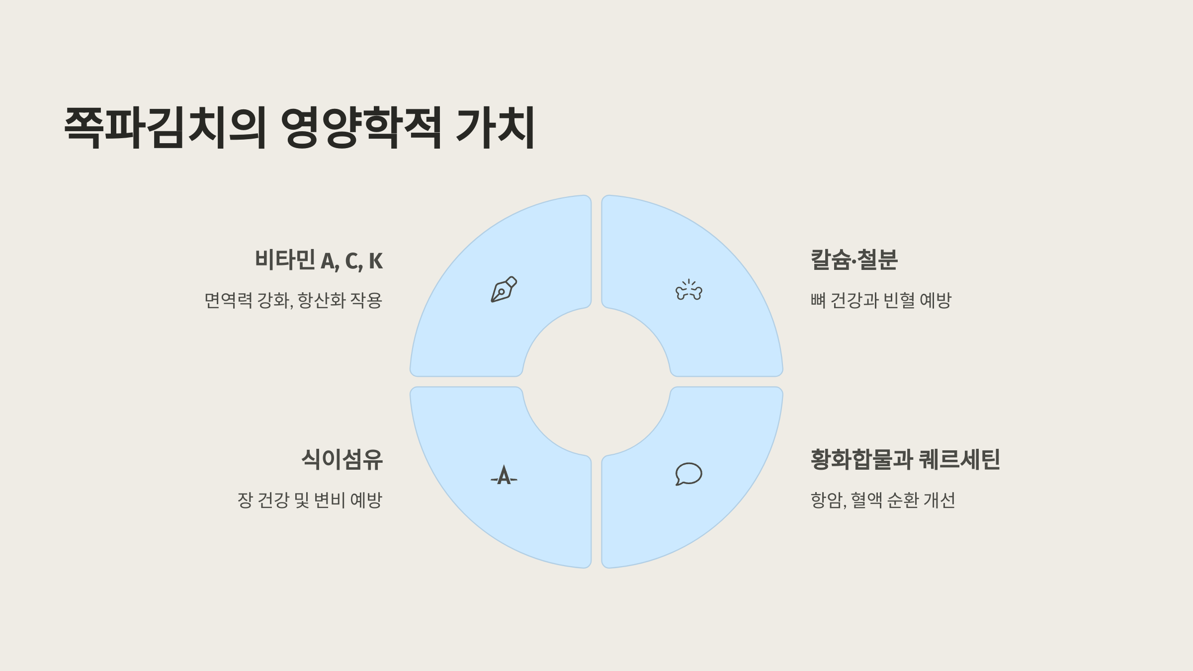 쪽파김치는 단순한 반찬을 넘어 영양학적으로도 뛰어난 식품입니다. 쪽파에는 비타민 A, C, K가 풍부하게 함유되어 있으며, 항산화 성분인 퀘르세틴도 다량 포함되어 있습니다. 또한 쪽파김치를 담글 때 사용하는 양념들은 각각의 영양소를 더해 더욱 건강한 발효식품으로 만들어줍니다.