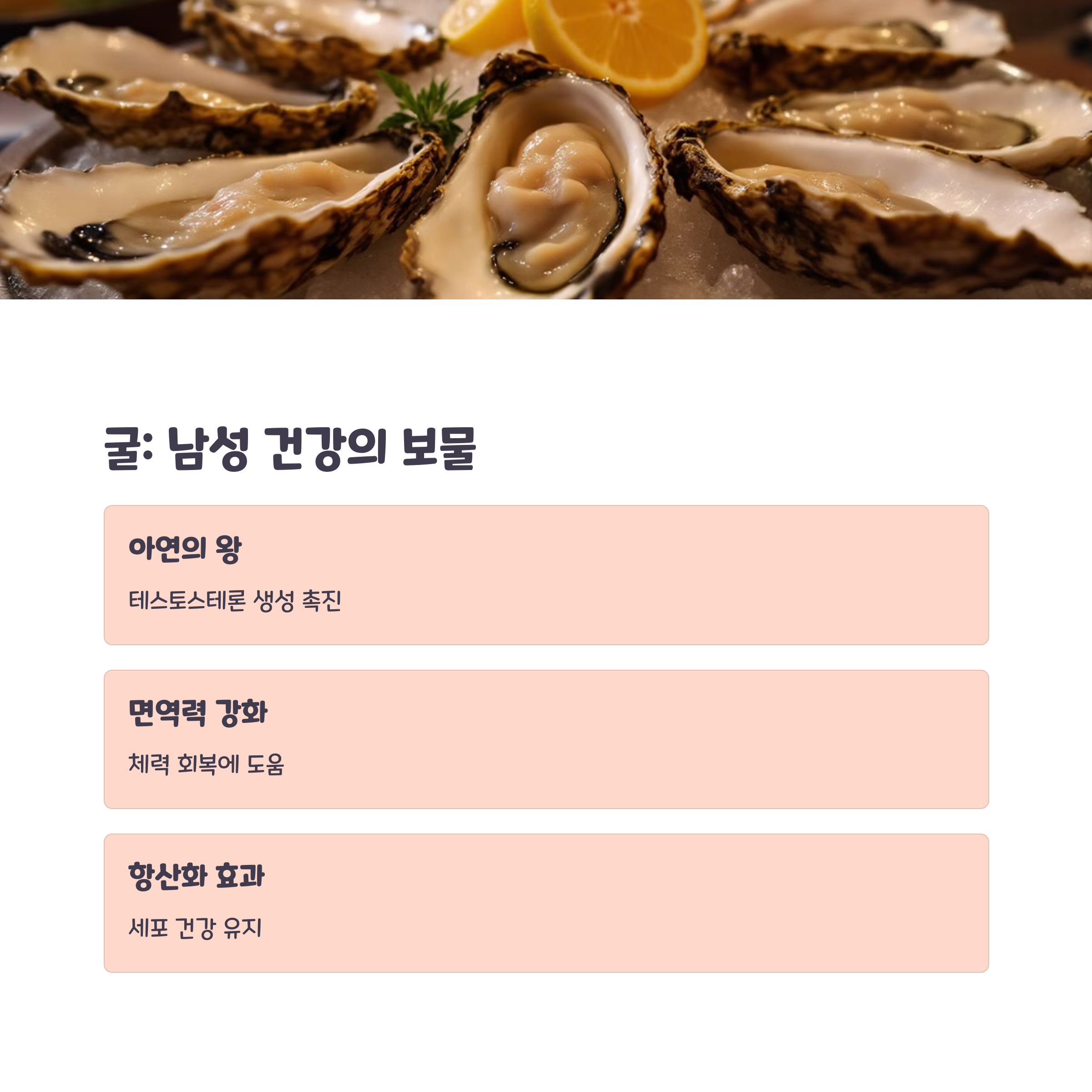 다섯 번째는 굴이에요. "바다의 우유"라는 별명답게 아연과 타우린이 풍부하죠. 아연은 정자 생성과 테스토스테론 분비를 돕고, 타우린은 피로 회복에 좋아요.