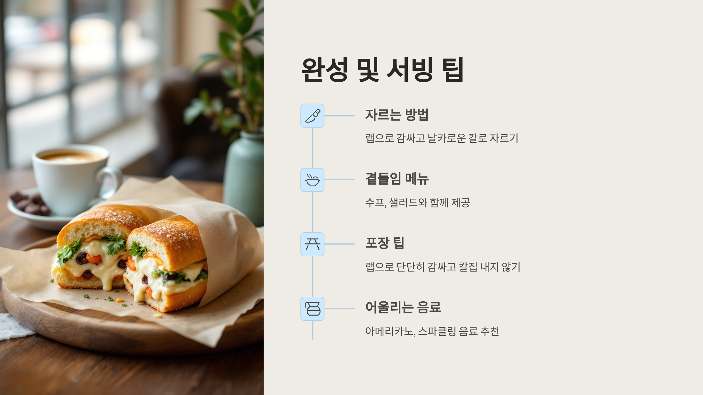 A: 치아바타 빵은 수분을 잘 흡수하면서도 형태를 유지하는 특성이 있어 미리 준비해도 괜찮습니다. 다만 최상의 맛을 위해서는 소스나 수분이 많은 재료(토마토, 오이 등)는 먹기 직전에 넣는 것이 좋습니다. 랩으로 단단히 싸서 냉장고에 2-3시간 정도 보관 가능합니다.