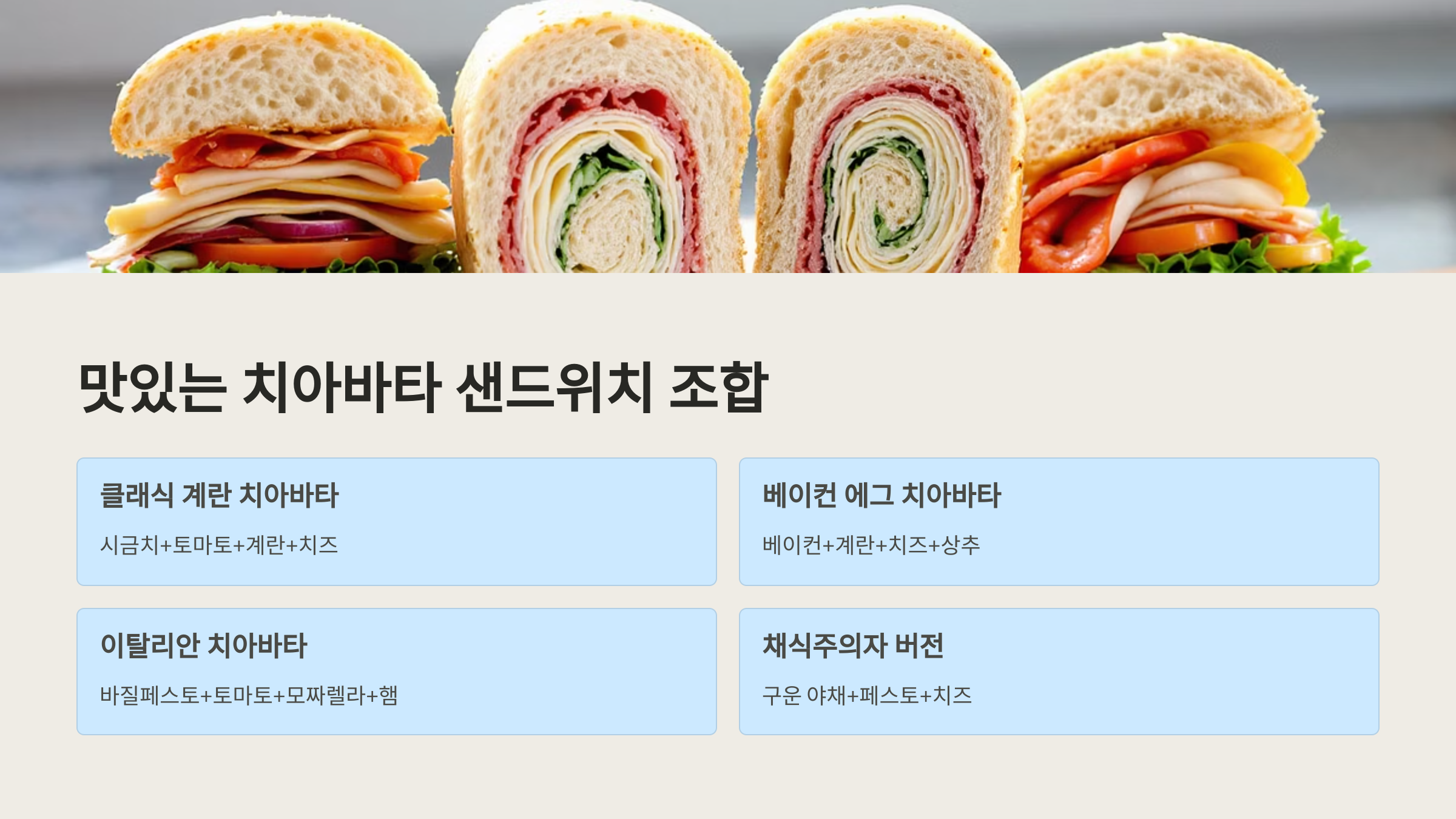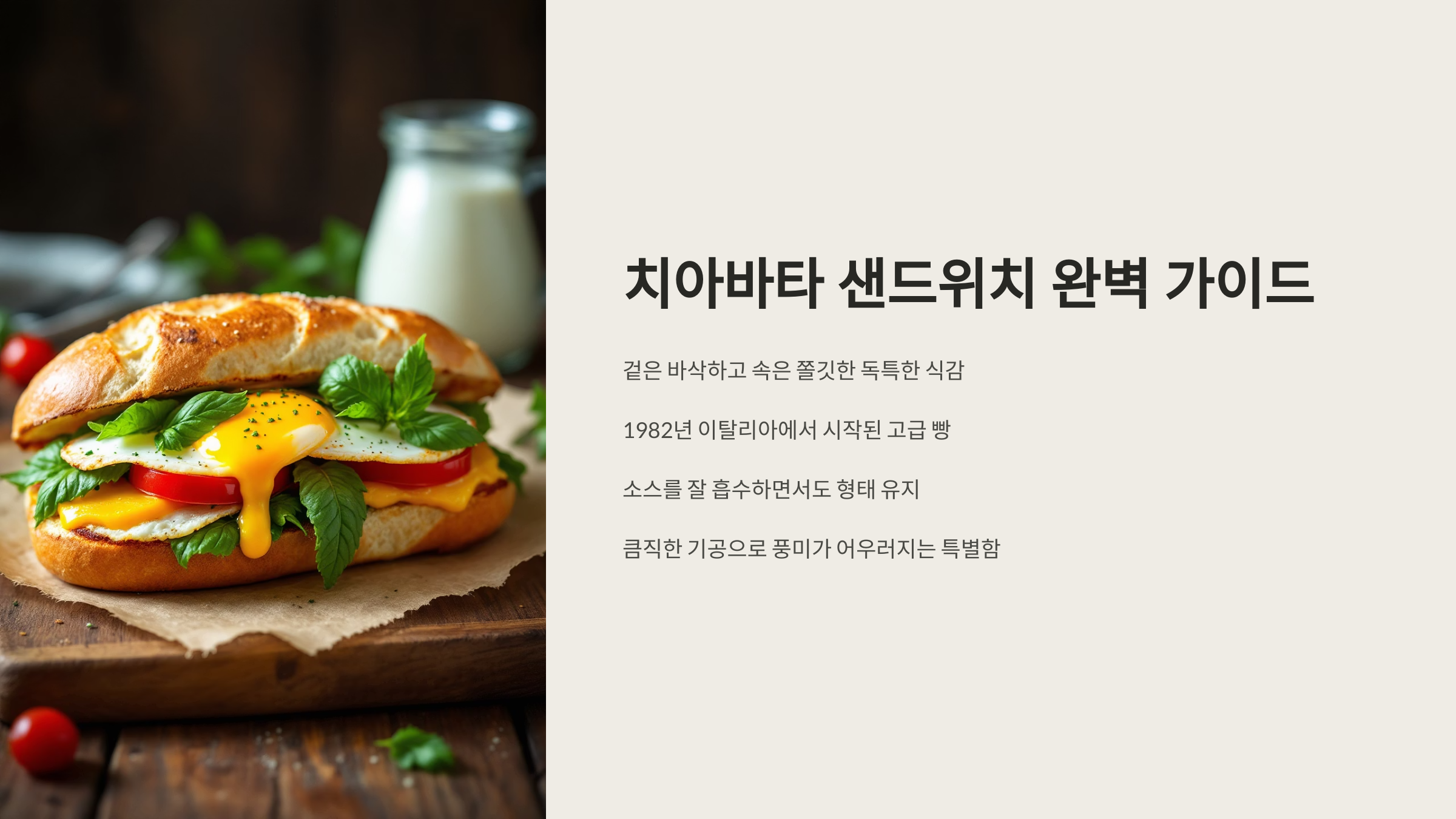 안녕하세요, 오늘은 집에서도 카페 부럽지 않은 치아바타 샌드위치 만들기에 대한 모든 것을 알려드릴게요! 식빵으로 만드는 일반 샌드위치와는 차원이 다른 풍미와 식감을 가진 치아바타 빵으로 특별한 한 끼를 준비해보세요.