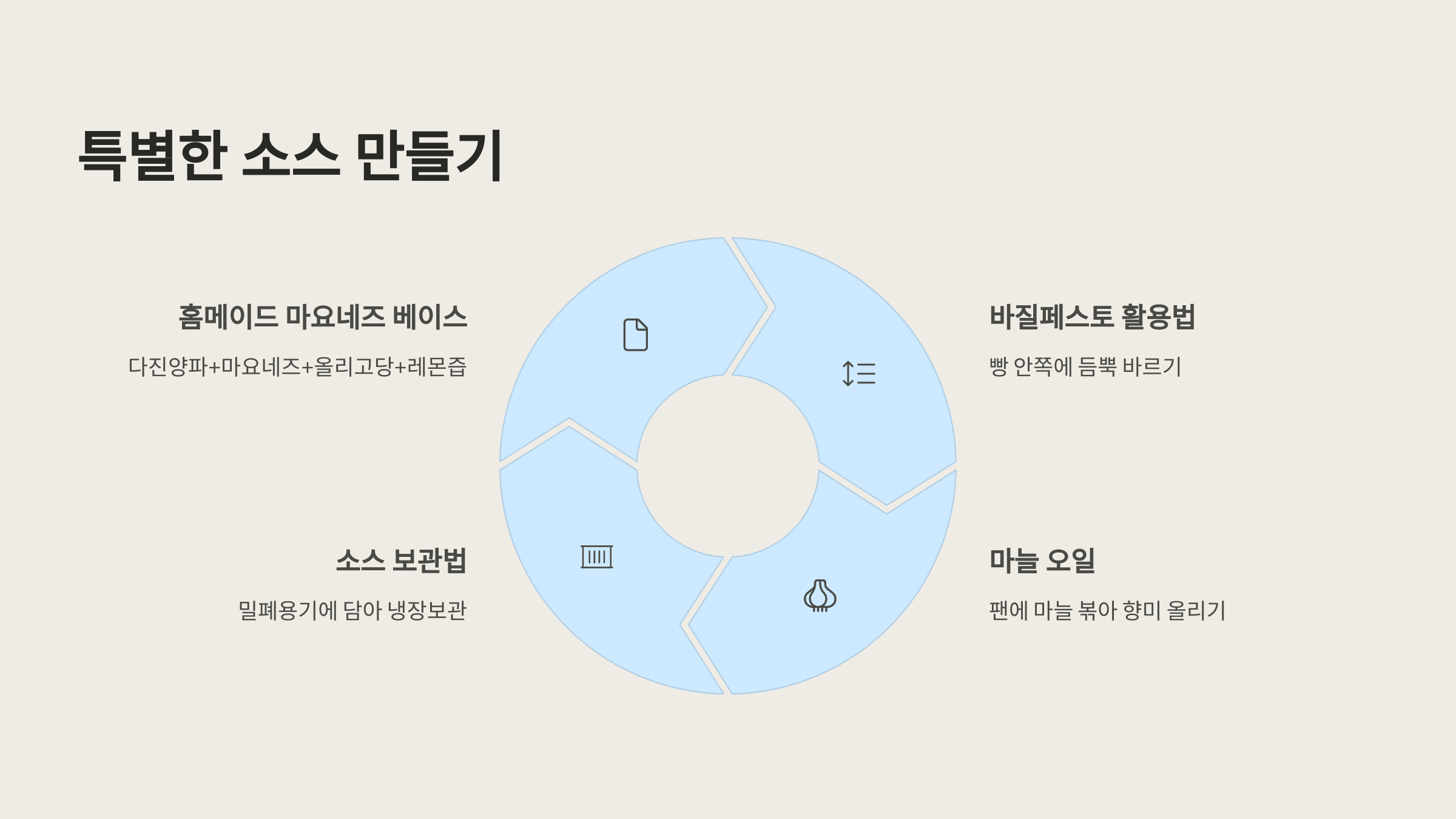 | 소스 및 양념 | 마요네즈, 머스타드, 페스토, 바질, 후추, 올리브 오일 등 |