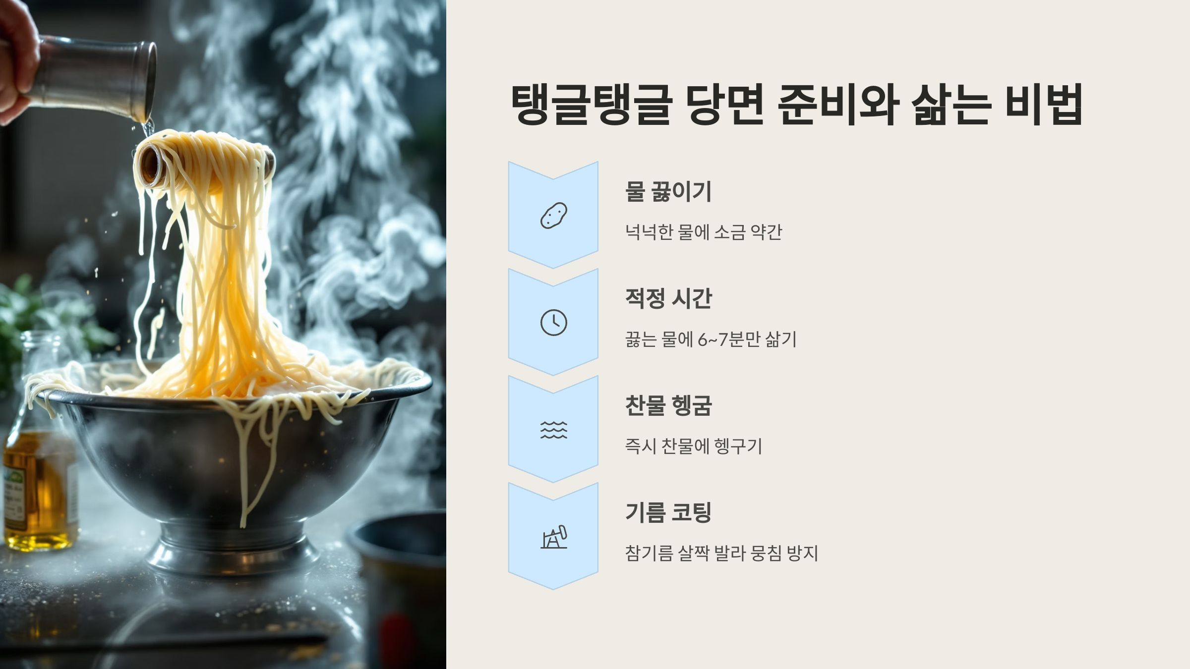 A: 당면 삶는 시간을 정확히 지키는 것이 중요해요 (포장지 시간 확인!). 삶은 후 찬물 헹굼 없이 뜨거운 상태에서 바로 양념과 참기름으로 코팅해주면 뭉침과 불림을 방지할 수 있습니다. 또, 모든 재료를 섞을 때 너무 오래 버무리지 않는 것도 팁입니다.