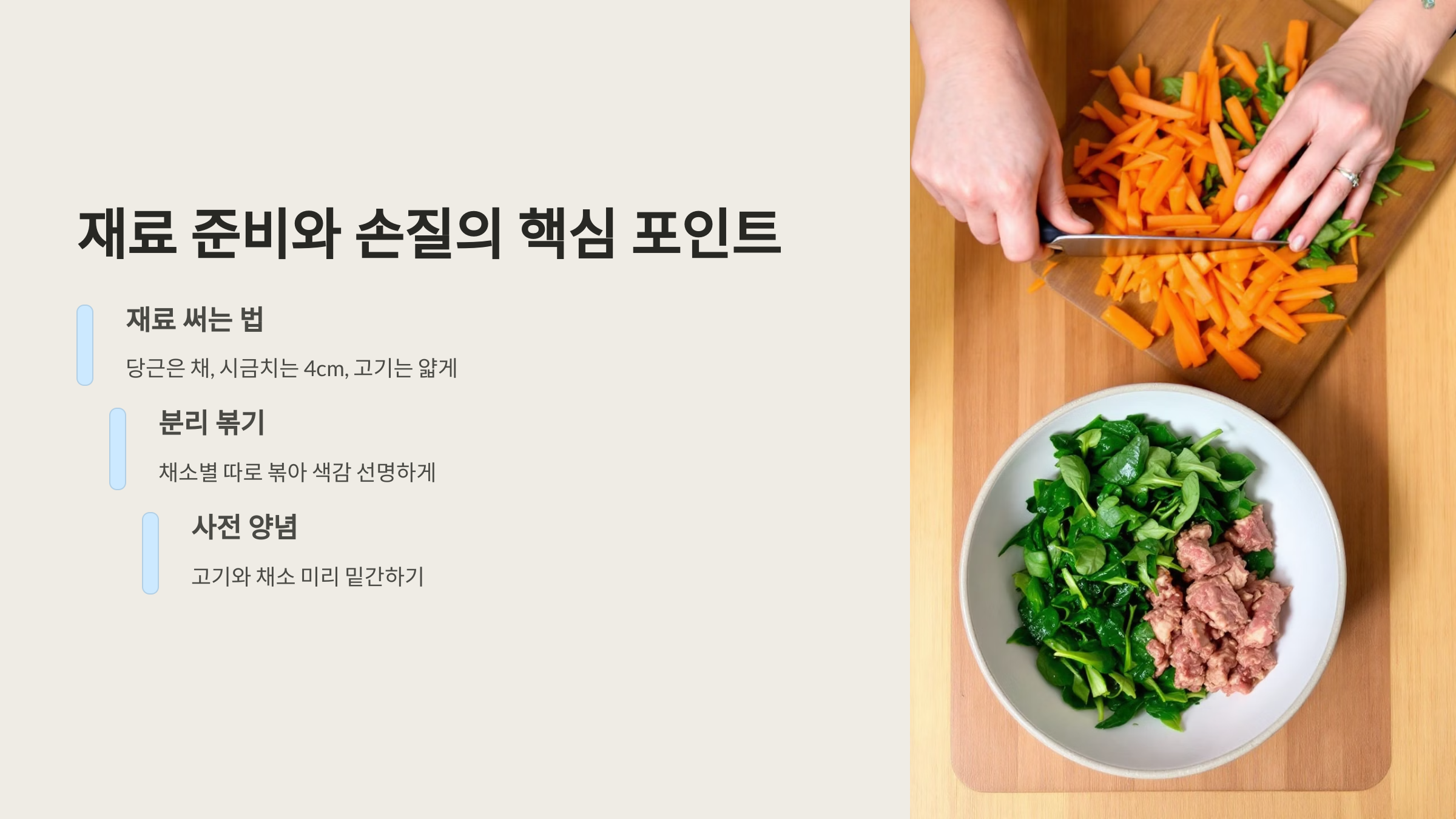 하지만 몇 가지 핵심 포인트만 알면 이런 걱정 없이 완벽한 잡채를 완성할 수 있답니다! 핵심은 바로 '재료별 조리'와 '당면 처리', 그리고 '황금 비율 양념'에 있습니다. 지금부터 그 비법을 차근차근 풀어가 보겠습니다.