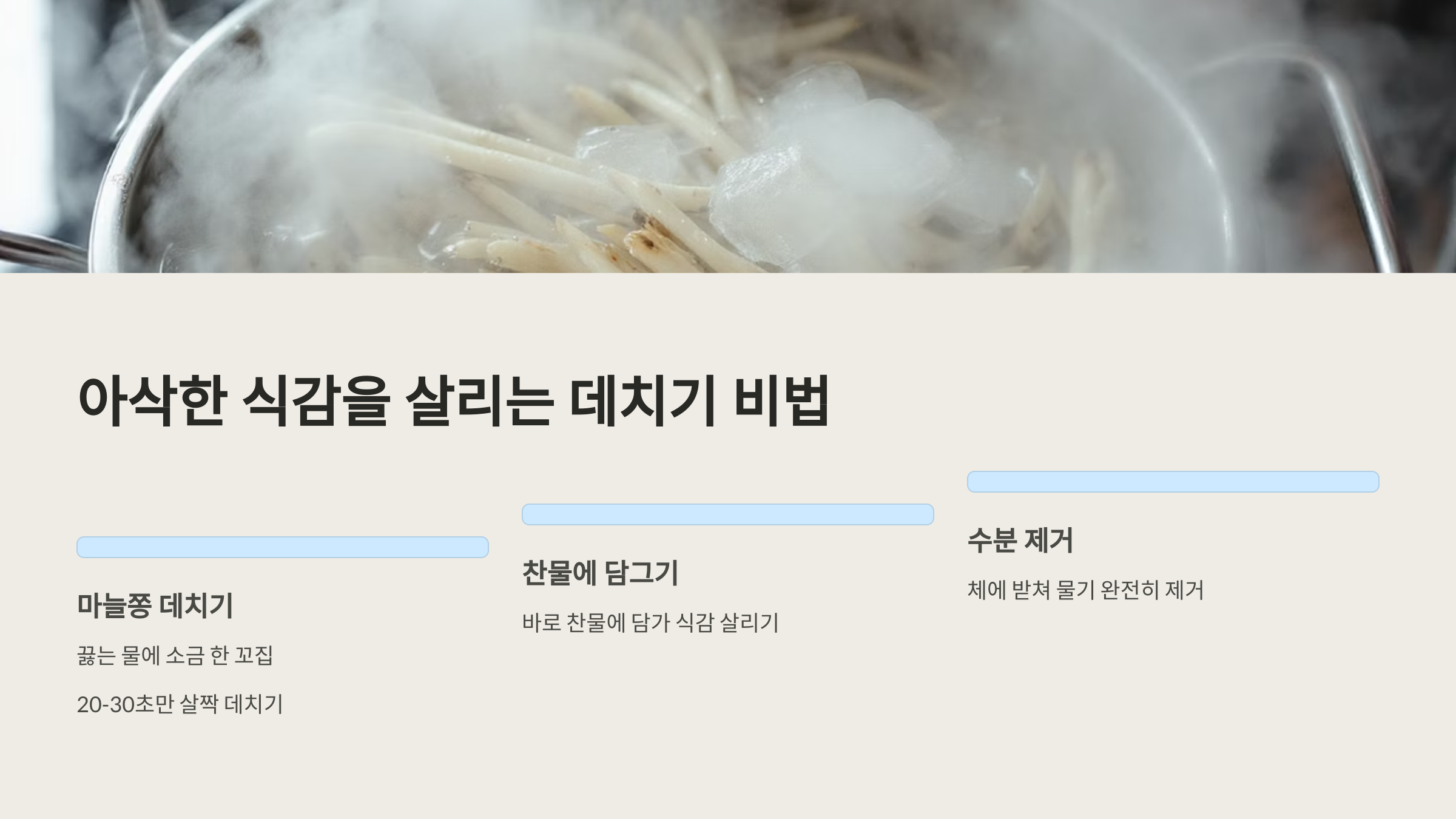 너무 오래 데치면 물컹해지니 주의! 데친 마늘쫑은 바로 찬물에 헹궈 열기를 식히고 체에 밭쳐 물기를 빼줍니다. 이렇게 하면 색감도 훨씬 선명해져요. 🥕
