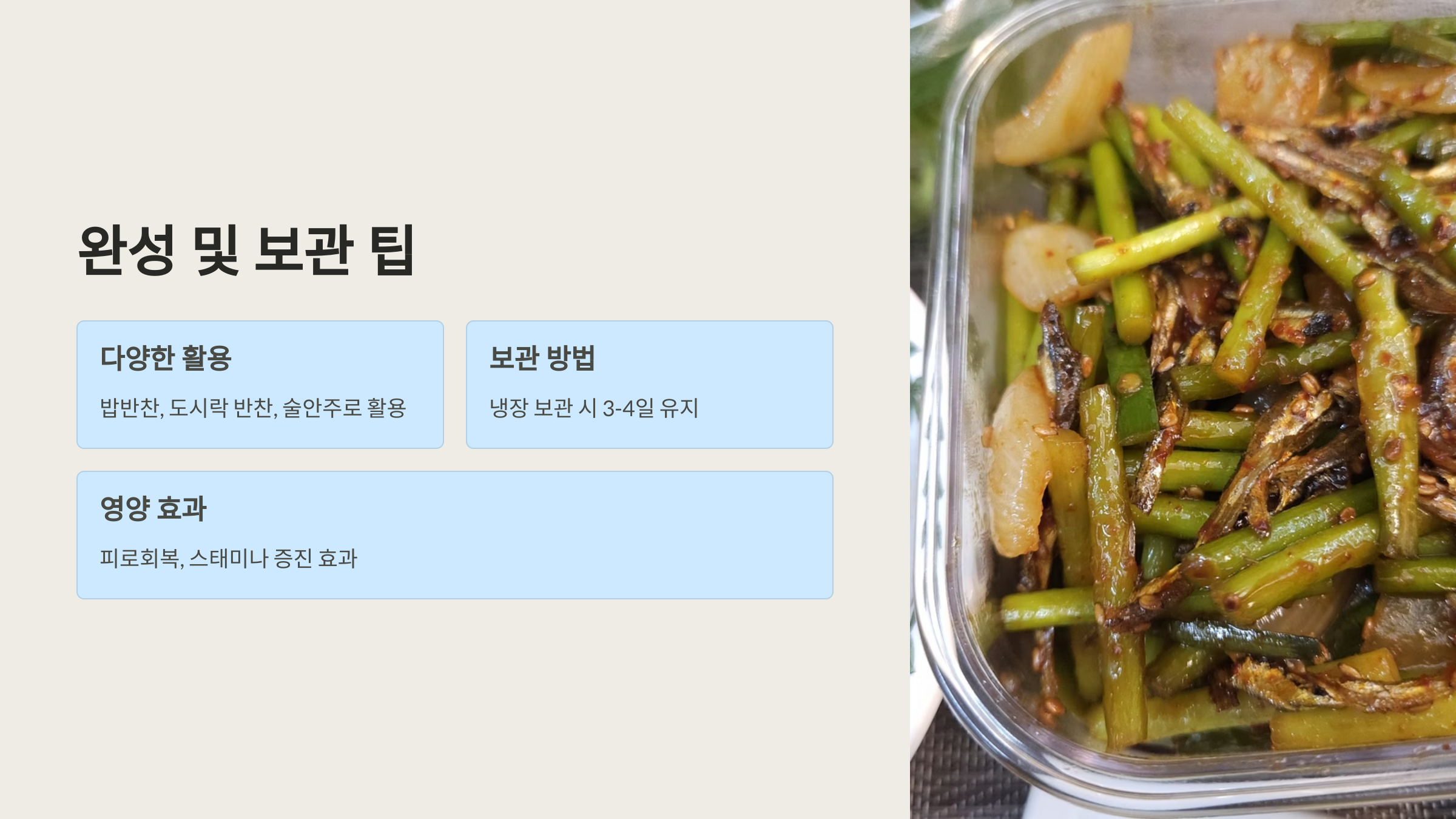 - 보관법: 완성된 마늘쫑멸치볶음은 완전히 식힌 후 밀폐 용기에 담아 냉장 보관해주세요. 보통 3~5일 정도 맛있게 드실 수 있습니다.
