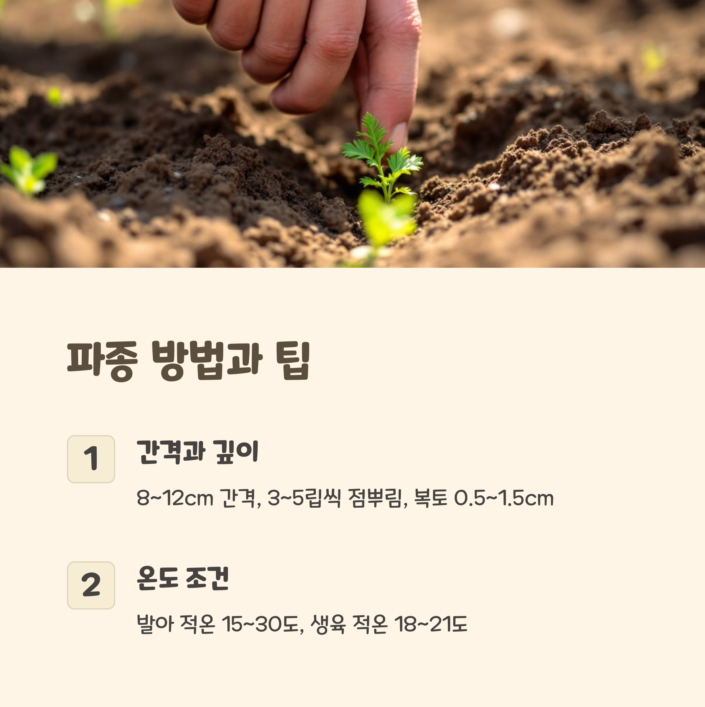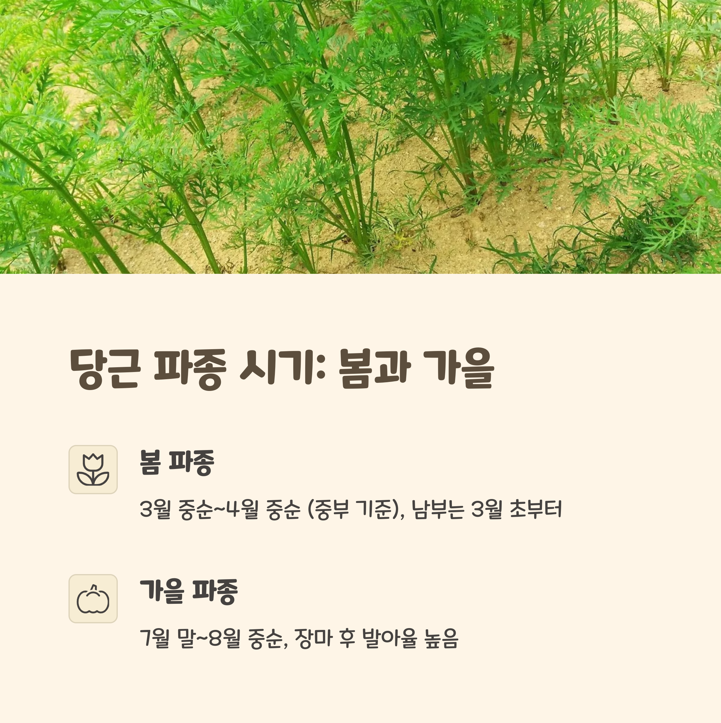 당근은 서늘한 기후를 좋아하는 작물이라 계절에 따라 파종 시기를 잘 맞추는 게 중요해요.