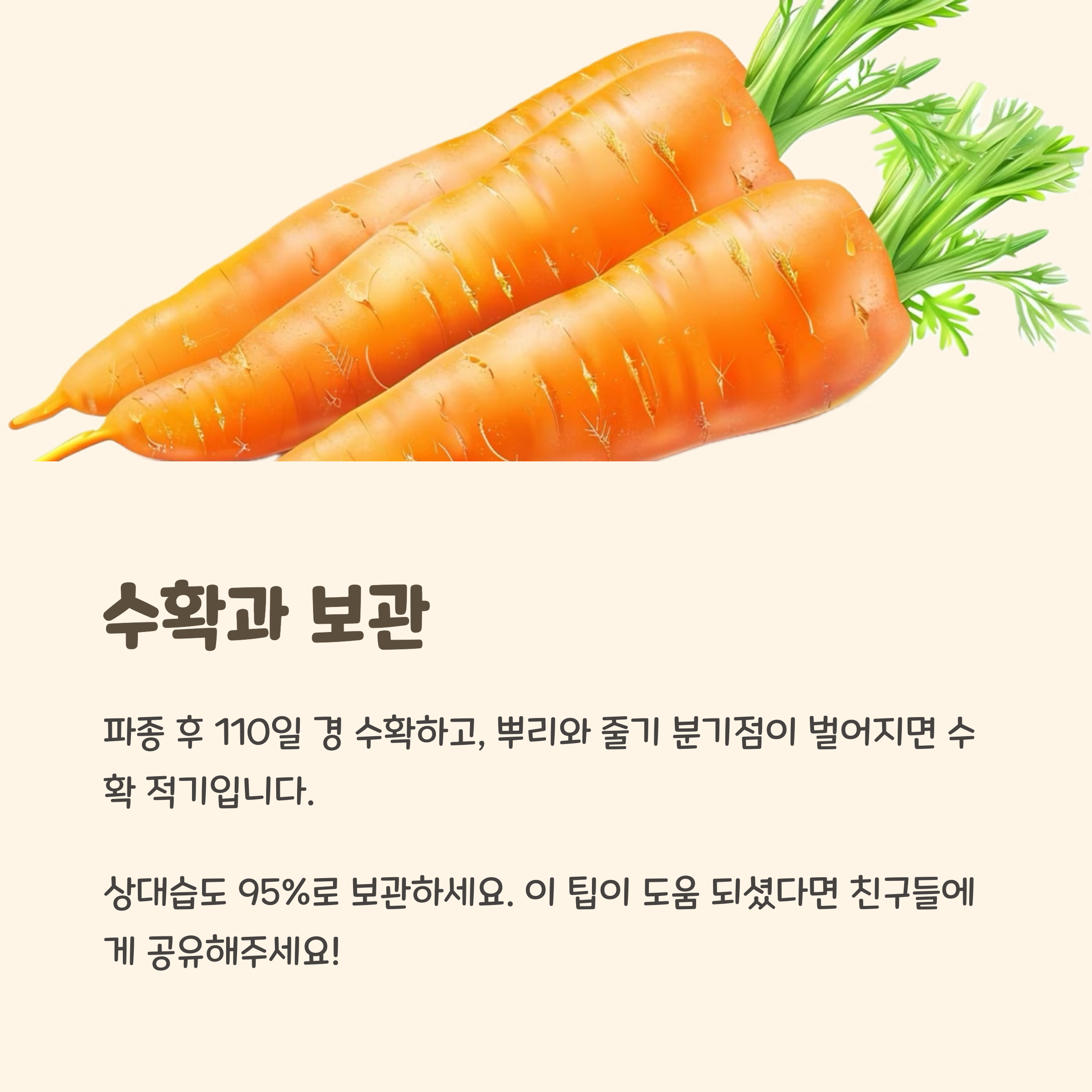 당근 재배는 어렵지 않아요. 당근 파종시기만 잘 맞추고 토양과 물 관리에 조금 신경 쓰면 누구나 집에서 신선한 당근을 즐길 수 있답니다. 이번 봄이나 가을, 텃밭에 당근 심어보는 건 어떨까요? 여러분의 성공적인 농사를 응원할게요! 💪